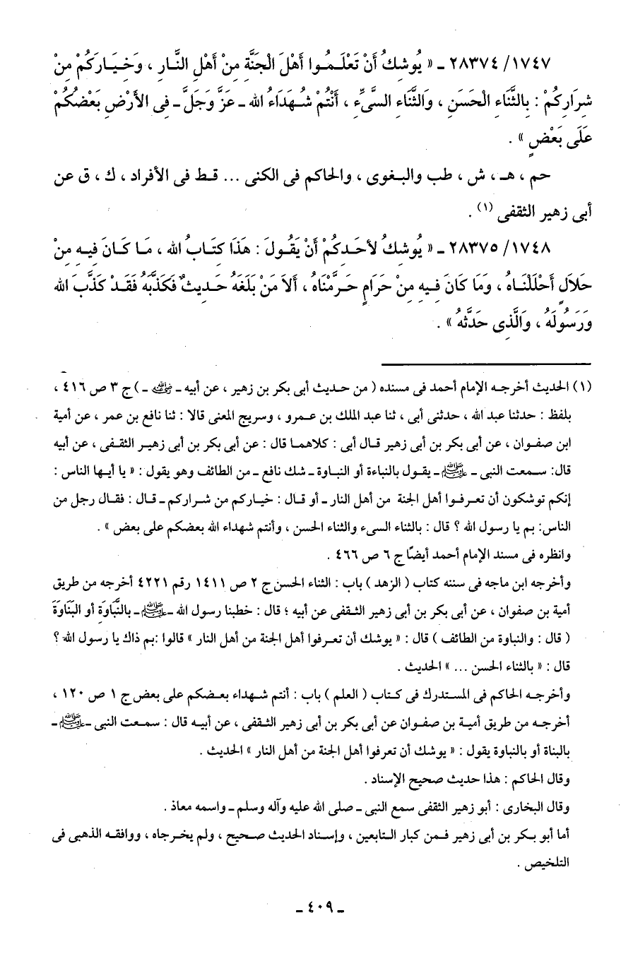 1747/ 28374 - "يُوشِكُ أَنْ تَعْلَمُوا أَهْلَ الْجَنَّةِ مِنْ أَهْلِ النَّارِ، وَخِيَارَكُمْ مِنْ شِرَارِكُمْ: بِالثَّنَاءِ الْحَسَنِ، وَالثَّنَاءِ السَّىِّءِ، أَنْتُمْ شُهَدَاءُ اللَّه -عَزَّ وَجَلَّ- فِى الأَرْضِ بَعْضُكُمْ عَلَى بَعْضٍ".