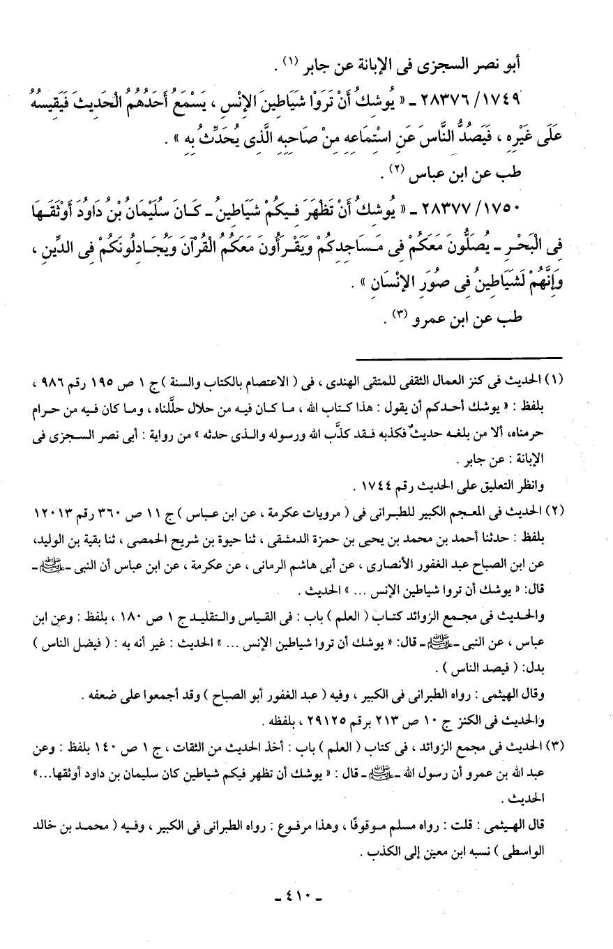 1749/ 28376 - "يُوشِكُ أَنْ تَرَوْا شَيَاطِينَ الإِنْسِ، يَسْمَعُ أَحَدُهُمُ الْحَدِيثَ فَيَقِيسُهُ عَلَى غَيْرِهِ، فَيَصُدُّ اِلنَّاسَ عَنِ اسْتِمَاعِهِ مِنْ صَاحِبِهِ الَّذِى يُحَدِّثُ بِهِ".
