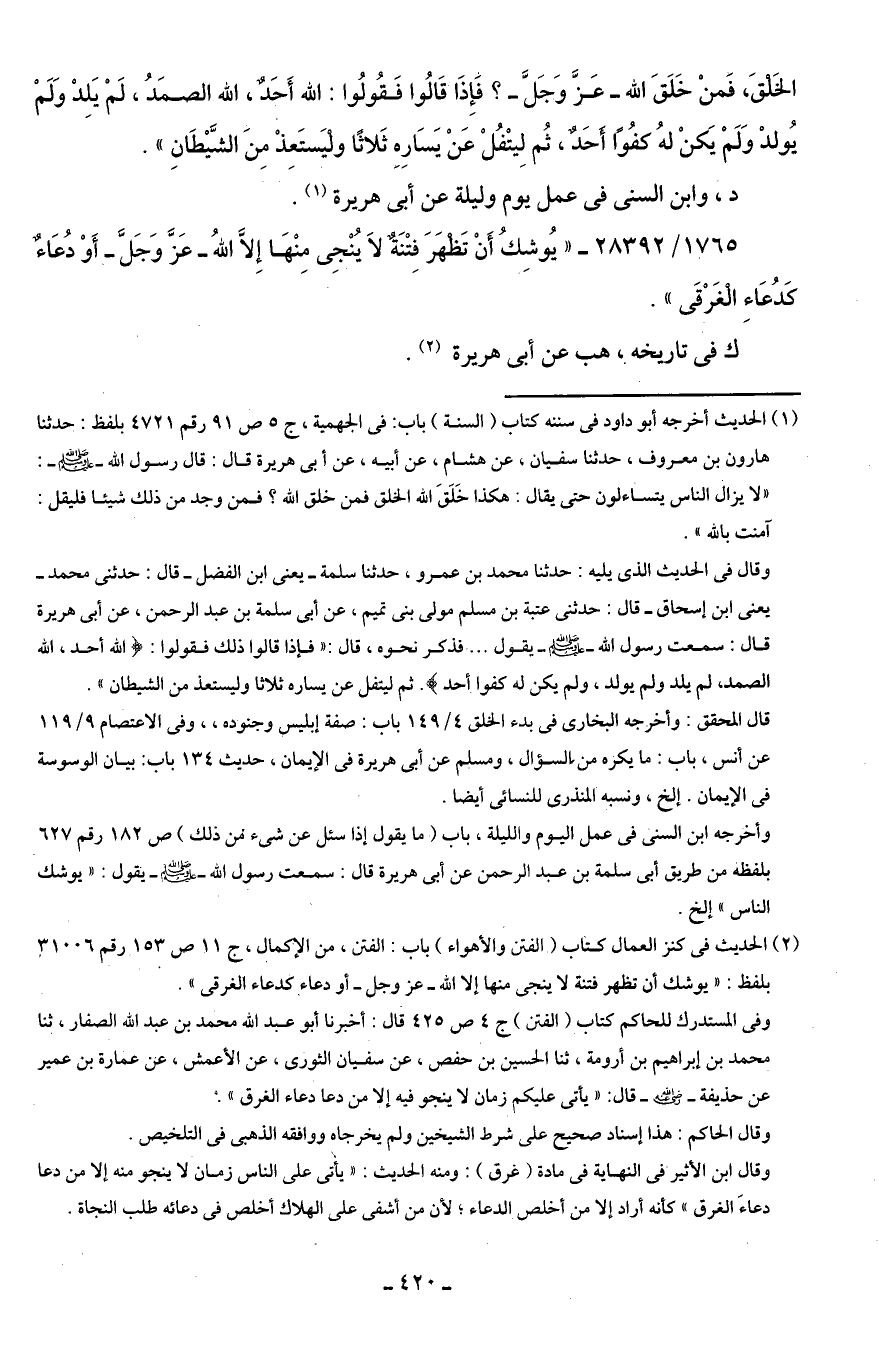 (¬1) الحديث أخرجه أبو داود في سننه كتاب (السنة) باب: في الجهمية، جـ 5 ص 91 رقم 4721 بلفظ: حدثنا هارون بن معروف، حدثنا سفيان، عن هشام، عن أبيه، عن أَبى هريرة قال: قال رسول اللَّه -صلى اللَّه عليه وسلم-: "لا يزال الناس يتساءلون حتى يقال: هكذا خَلَقَ اللَّه الخلق فمن خلق اللَّه؟ فمن وجد من ذلك شيئا فليقل: آمنت باللَّه".
