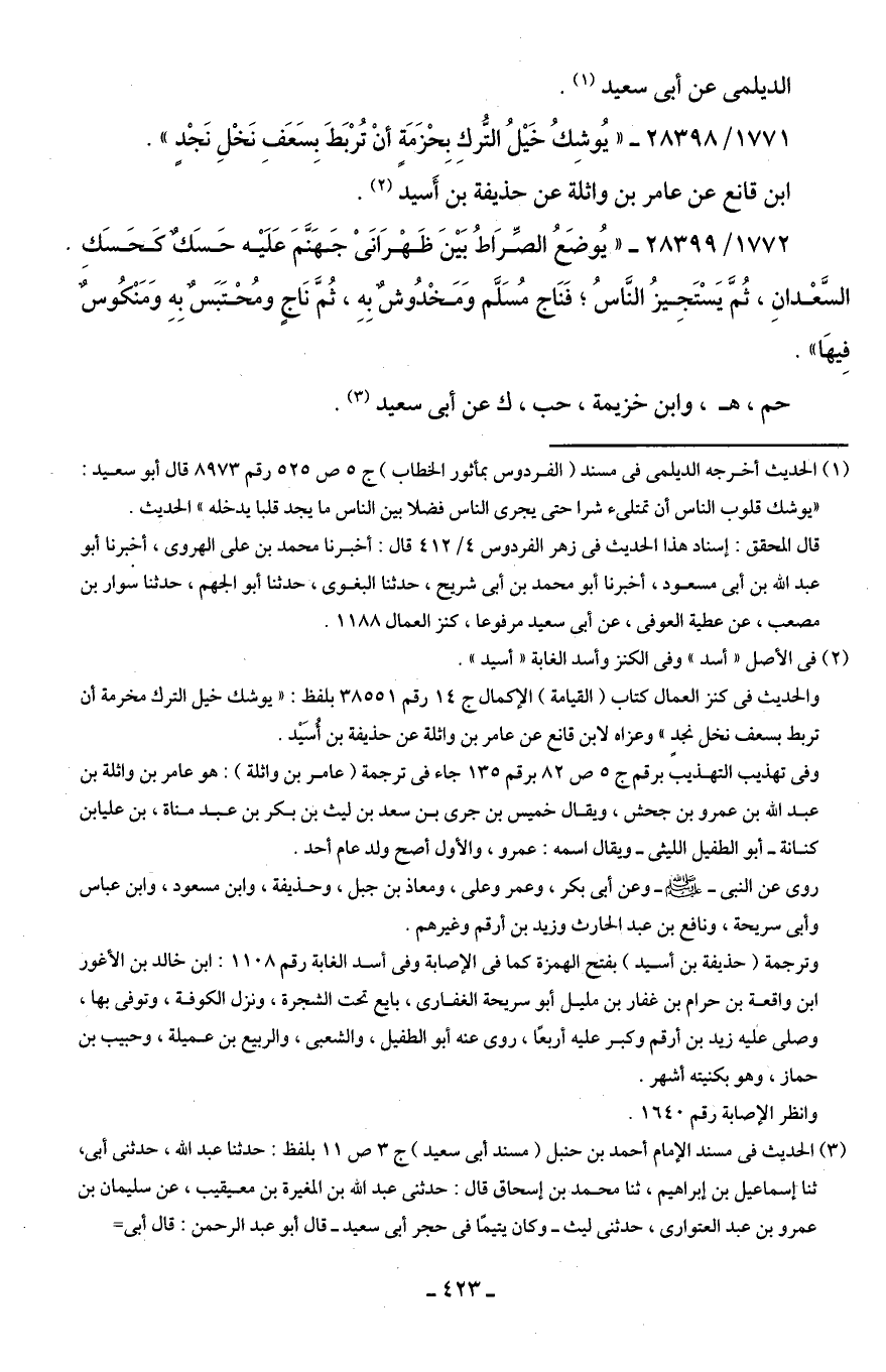 قال المحقق: إسناد هذا الحديث في زهر الفردوس 4/ 412 قال: أخبرنا محمد بن على الهروى، أخبرنا أبو عبد اللَّه بن أَبى مسعود، أخبرنا أبو محمد بن أَبى شريح، حدثنا البغوى، حدثنا أبو الجهم، حدثنا سوار بن مصعب، عن عطية العوفى، عن أَبى سعيد مرفوعا، كنز العمال 1188.
