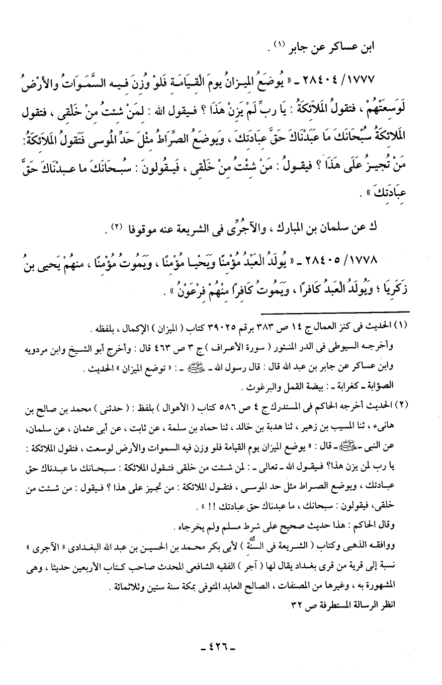 1777/ 28404 - "يُوضَعُ المِيزانُ يومَ الْقِيَامَةِ فَلوْ وُزِنَ فِيه السَّمَوَاتُ والأَرْضُ لَوَسِعَتْهُمْ، فتقولُ الْمَلَائِكَةُ: يَا ربِّ لَمْ يَزِنْ هَذَا؟ فيقول اللَّه: لِمَنْ شِئتُ مِنْ خَلقِى، فتقول المَلاِئكَةُ سُبْحَانَكَ مَا عَبَدْنَاكَ حَقَّ عِبَادَتِكَ، وَيوضَعُ الصِّرَاطُ مِثْلَ حَدِّ المُوسى فتَقولُ المَلَائِكَةُ: مَنْ تُجيزُ عَلَى هَذَا؟ فيقولُ: مَنْ شِئْتُ مِنْ خَلْقِى، فَيقُولونَ: سُبحَانَكَ ما عبدْنَاكَ حَقَّ عِبَادَتِكَ".