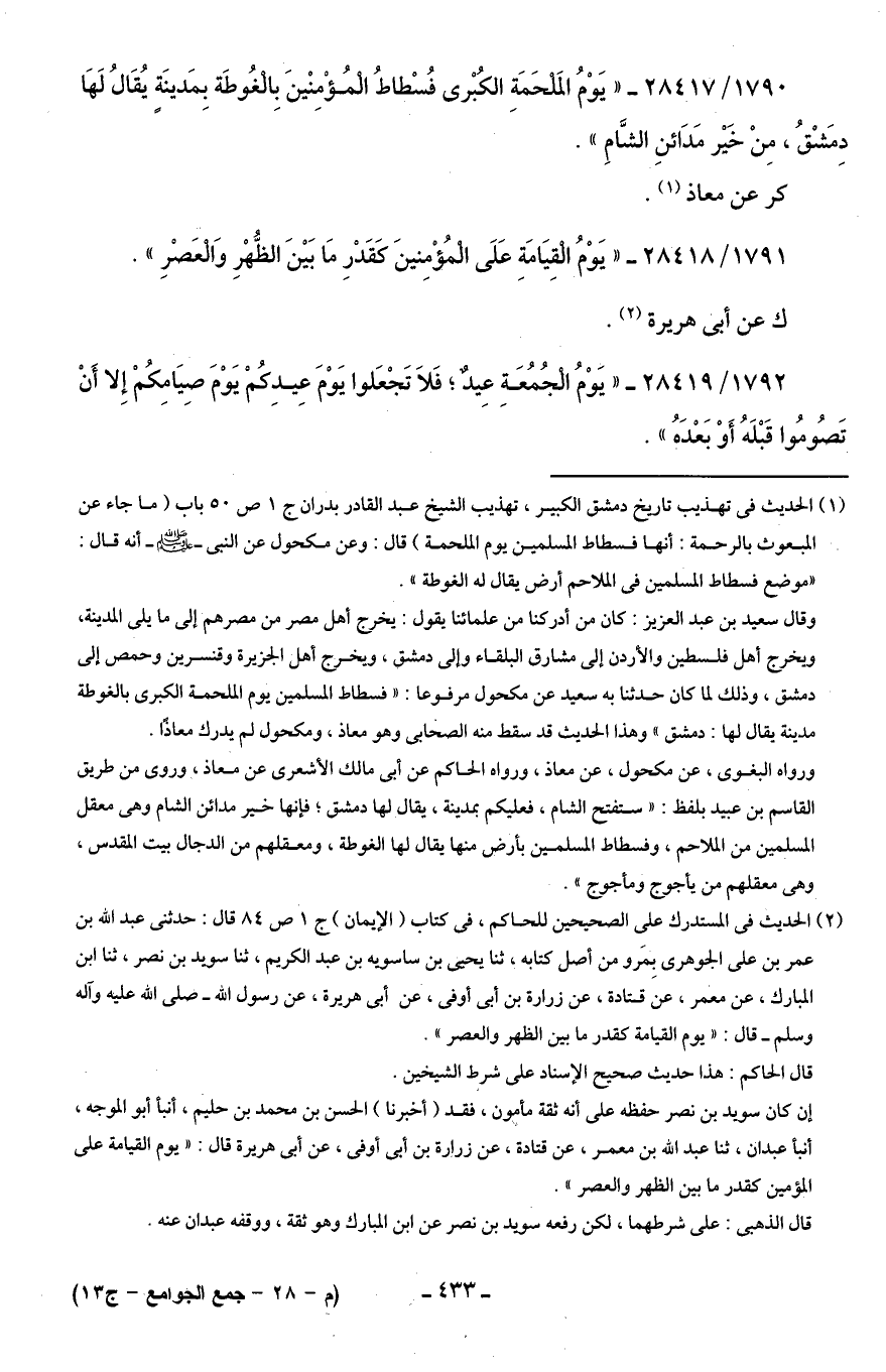 1790/ 28417 - "يَوْمُ المَلحَمَةِ الكُبْرى فُسْطاطُ المُؤْمِنيْنَ بِالْغُوطَة بِمَدينَةٍ يُقَالُ لَهَا دِمَشْقُ، مِنْ خَيْر مَدَائنِ الشَّامِ".