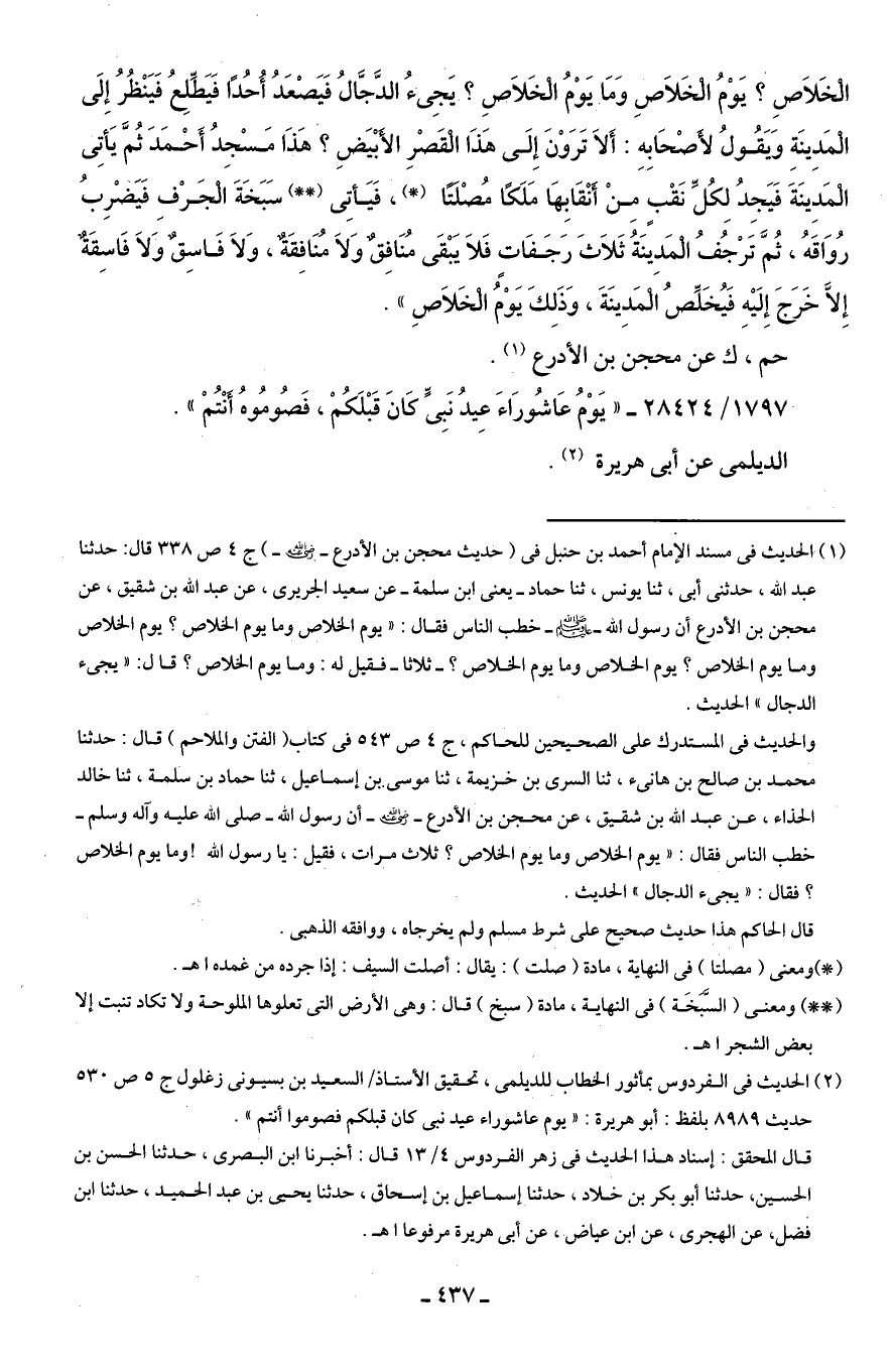 (¬1) الحديث في مسند الإمام أحمد بن حنبل في (حديث محجن بن الأدرع - رضي الله عنه -) ج 4 ص 338 قال: حدثنا عبد الله، حدثنى أبى، ثنا يونس، ثنا حماد - يعنى ابن سلمة - عن سعيد الجريرى، عن عبد الله بن شقيق، عن محجن بن الأدرع أن رسول الله - صلى الله عليه وسلم - خطب الناس فقال: "يوم الخلاص وما يوم الخلاص؟ يوم الخلاص وما يوم الخلاص؟ يوم الخلاص وما يوم الخلاص؟ - ثلاثا - فقيل له: وما يوم الخلاص؟ قال: "يجئ الدجال" الحديث.