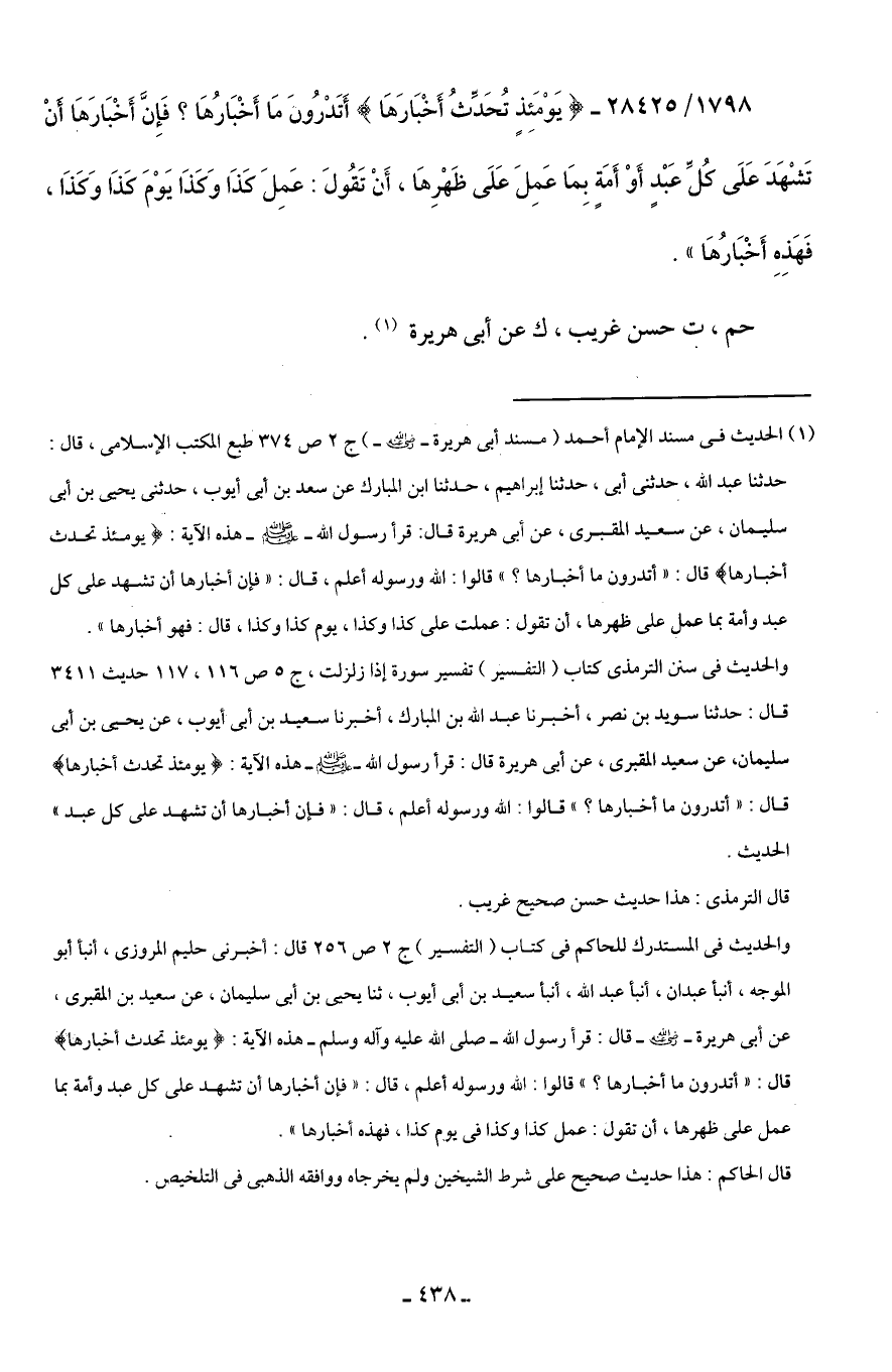 (¬1) الحديث في مسند الإمام أحمد (مسند أبى هريرة - رضي الله عنه -) ج 2 ص 374 طبع المكتب الإسلامى، قال: حدثنا عبد الله، حدثنى أبى، حدثنا إبراهيم، حدثنا ابن المبارك عن سعد بن أبى أيوب، حدثنى يحيى بن أبى سليمان، عن سعيد المقبرى، عن أبى هريرة قال: قرأ رسول الله - صلى الله عليه وسلم - هذه الآية: {يَوْمَئِذٍ تُحَدِّثُ أَخْبَارَهَا} قال: "أتدرون ما أخبارها؟ " قالوا: الله ورسوله أعلم، قال: "فإن أخبارها أن تشهد على كل عبد وأمة بما عمل على ظهرها، أن تقول: عملت على كذا وكذا، يوم كذا وكذا، قال: فهو أخبارها".