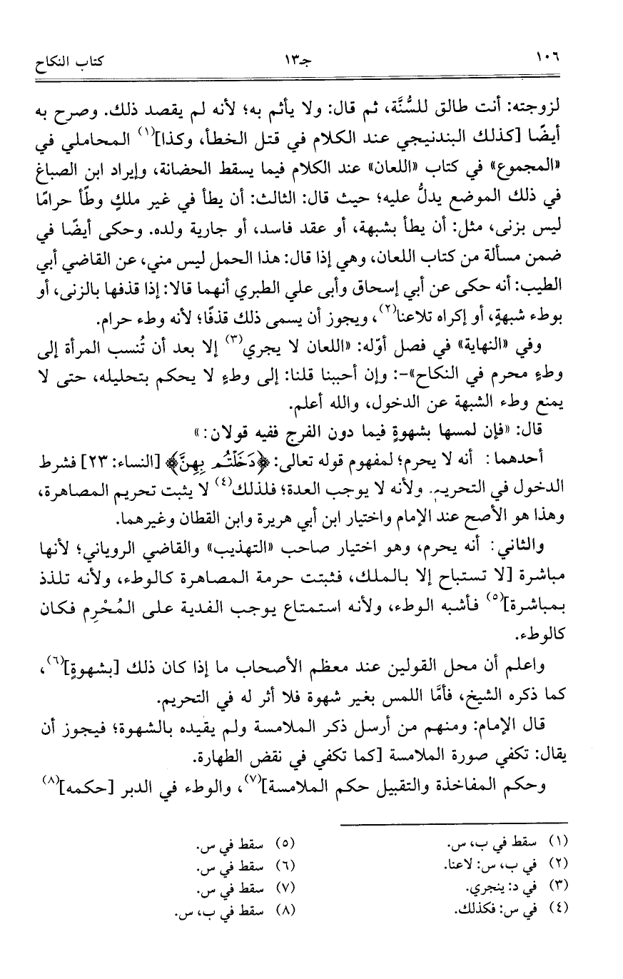 لزوجته: أنت طالق للسُّنَّة، ثم قال: ولا يأثم به؛ لأنه لم يقصد ذلك. وصرح به أيضاً [كذلك البندنيجي عند الكلام في قتل الخطأ، وكذا] المحاملي في "المجموع" في كتاب "اللعان" عند الكلام فيما يسقط الحضانة، وإيراد ابن الصباغ في ذلك الموضع يدلُّ عليه؛ حيث قال: الثالث: أن يطأ في غير ملكٍ وطأً حراماً ليس بزنى، مثل: أن يطأ بشبهة، أو عقد فاسد، أو جارية ولده. وحكى أيضاً في ضمن مسألة من كتاب اللعان، وهي إذا قال: هذا الحمل ليس مني، عن القاضي أبي الطيب: أنه حكى عن أبي إسحاق وأبي علي الطبري أنهما قالا: إذا قذفها بالزنى، أو بوطء شبهةٍ، أو إكراه تلاعنا، ويجوز أن يسمى ذلك قذفاً؛ لأنه وطء حرام.