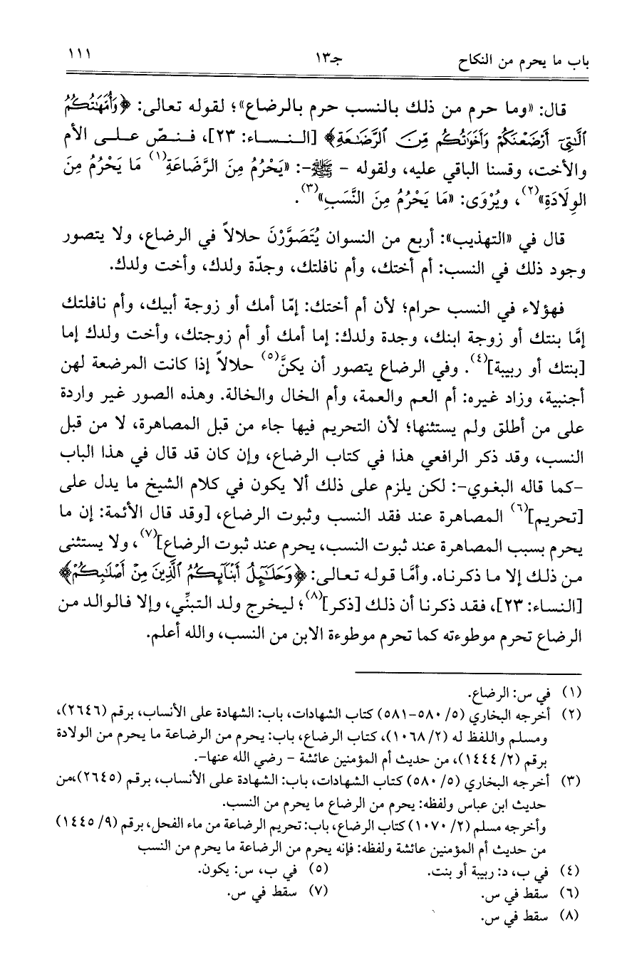 فهؤلاء في النسب حرام؛ لأن أم أختك: إمّا أمك أو زوجة أبيك، وأم نافلتك إمَّا بنتك أو زوجة ابنك، وجدة ولدك: إما أمك أو أم زوجتك، وأخت ولدك إما [بنتك أو ربيبة]. وفي الرضاع يتصور أن يكنَّ حلالاً إذا كانت المرضعة لهن أجنبية، وزاد غيره: أم العم والعمة، وأم الخال والخالة. وهذه الصور غير واردة على من أطلق ولم يستثنها؛ لأن التحريم فيها جاء من قبل المصاهرة، لا من قبل النسب، وقد ذكر الرافعي هذا في كتاب الرضاع، وإن كان قد قال في هذا الباب- كما قاله البغوي-: لكن يلزم على ذلك ألا يكون في كلام الشيخ ما يدل على [تحريم] المصاهرة عند فقد النسب وثبوت الرضاع، [وقد قال الأئمة: إن ما يحرم بسبب المصاهرة عند ثبوت النسب، يحرم عند ثبوت الرضاع]، ولا يستثنى من ذلك إلا ما ذكرناه. وأمَّا قوله تعالى: {وَحَلائِلُ أَبْنَائِكُمْ الَّذِينَ مِنْ أَصْلابِكُمْ} [النساء: 23]، فقد ذكرنا أن ذلك [ذكر]؛ ليخرج ولد التبنِّي، وإلا فالوالد من الرضاع تحرم موطوءته كما تحرم موطوءة الابن من النسب، والله أعلم.