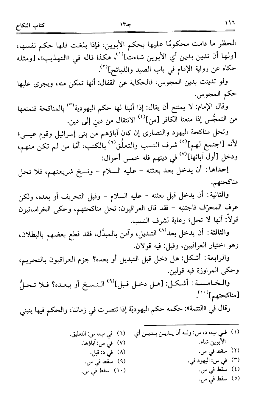 وتحل مناكحة اليهود والنصارى إن كان آباؤهم من بني إسرائيل وقوم عيسى؛ لأنه [اجتمع لهم] شرف النسب والتعلُّق بالكتب، أمَّا من لم تكن منهم، ودخل [أول آبائها] في دينهم فله خمس أحوال: