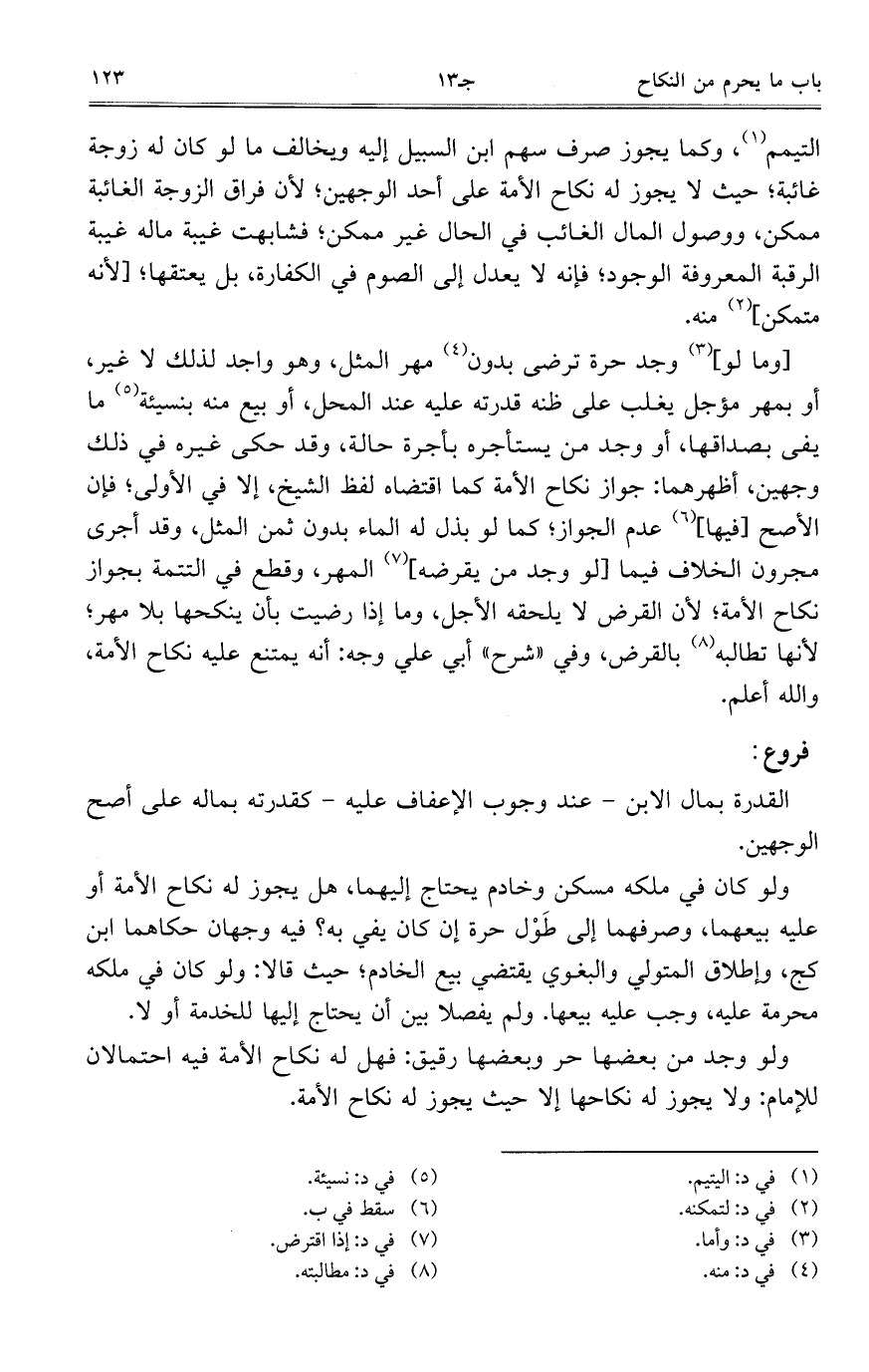 ولو وجد من بعضها حر وبعضها رقيق: فهل لو نكاح الأمة فيه احتمالان للإمام: ولا يجوز له نكاحها إلا حيث يجوز له نكاح الأمة.