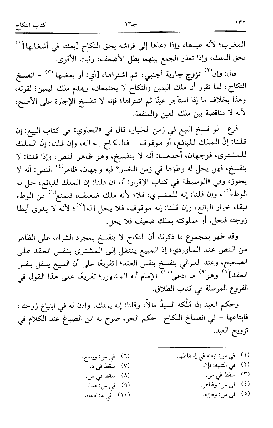 وقد ظهر بمجموع ما ذكرناه أن النكاح لا ينفسخ بمجرد الشراء، على الظاهر من النص عند الماوردي؛ إذ المبيع ينتقل إلى المشتري بنفس العقد على الصحيح، وعند الغزالي ينفسخ بنفس العقد؛ [تفريعاً على أن المبيع ينتقل بنفس العقد] وهو ما ادعى الإمام أنه المشهور؛ تفريعاً على هذا القول في الفروع المسلة في كتاب الطلاق.
