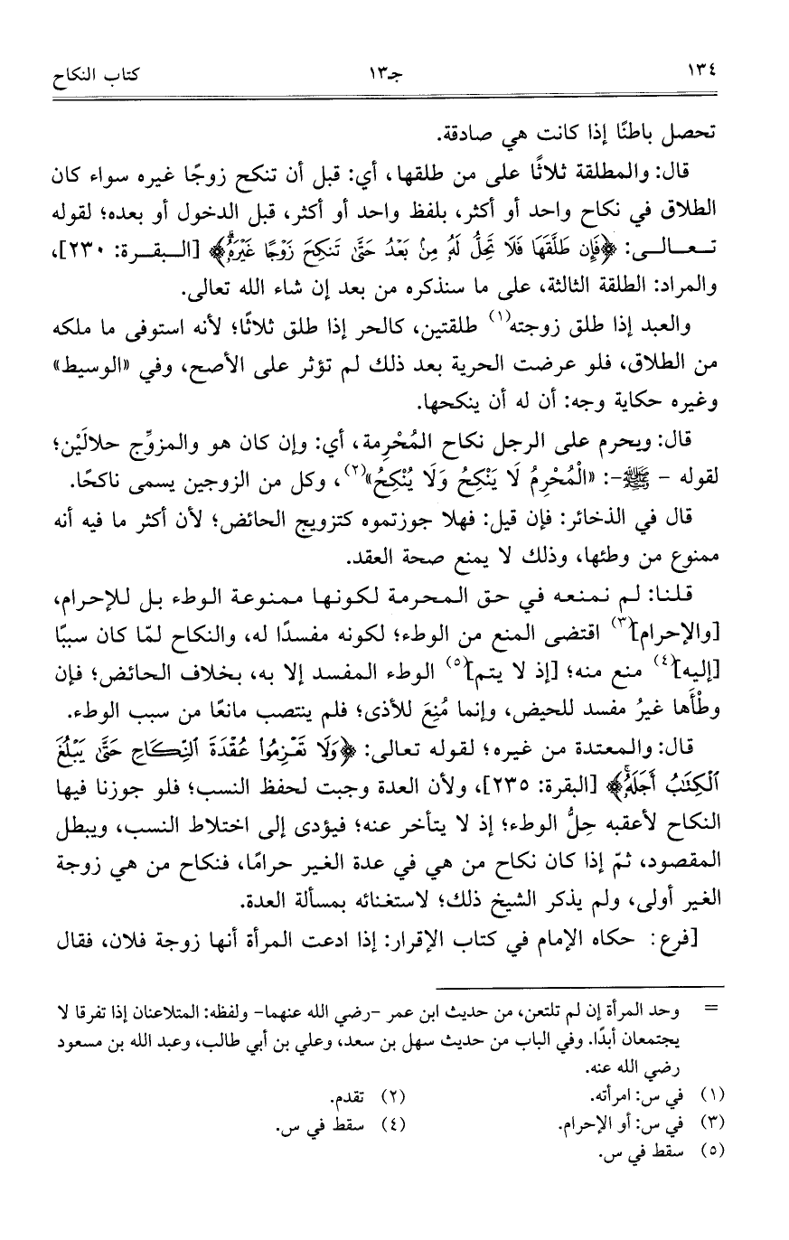 قال: والمطلقة ثلاثاً على من طلقها، أي: قبل أن تنكح زوجاً غيره سواء كان الطلاق في نكاح واحد أو أكثر، بلفظ واحد أو أكثر، قبل الدخول أو بعده؛ لقوله تعالى: {فَإِنْ طَلَّقَهَا فَلا تَحِلُّ لَهُ مِنْ بَعْدُ حَتَّى تَنكِحَ زَوْجاً غَيْرَهُ} [البقرة: 230]، والمراد: الطلقة الثالثة، على ما سنذكره من بعد إن شاء الله تعالى.
