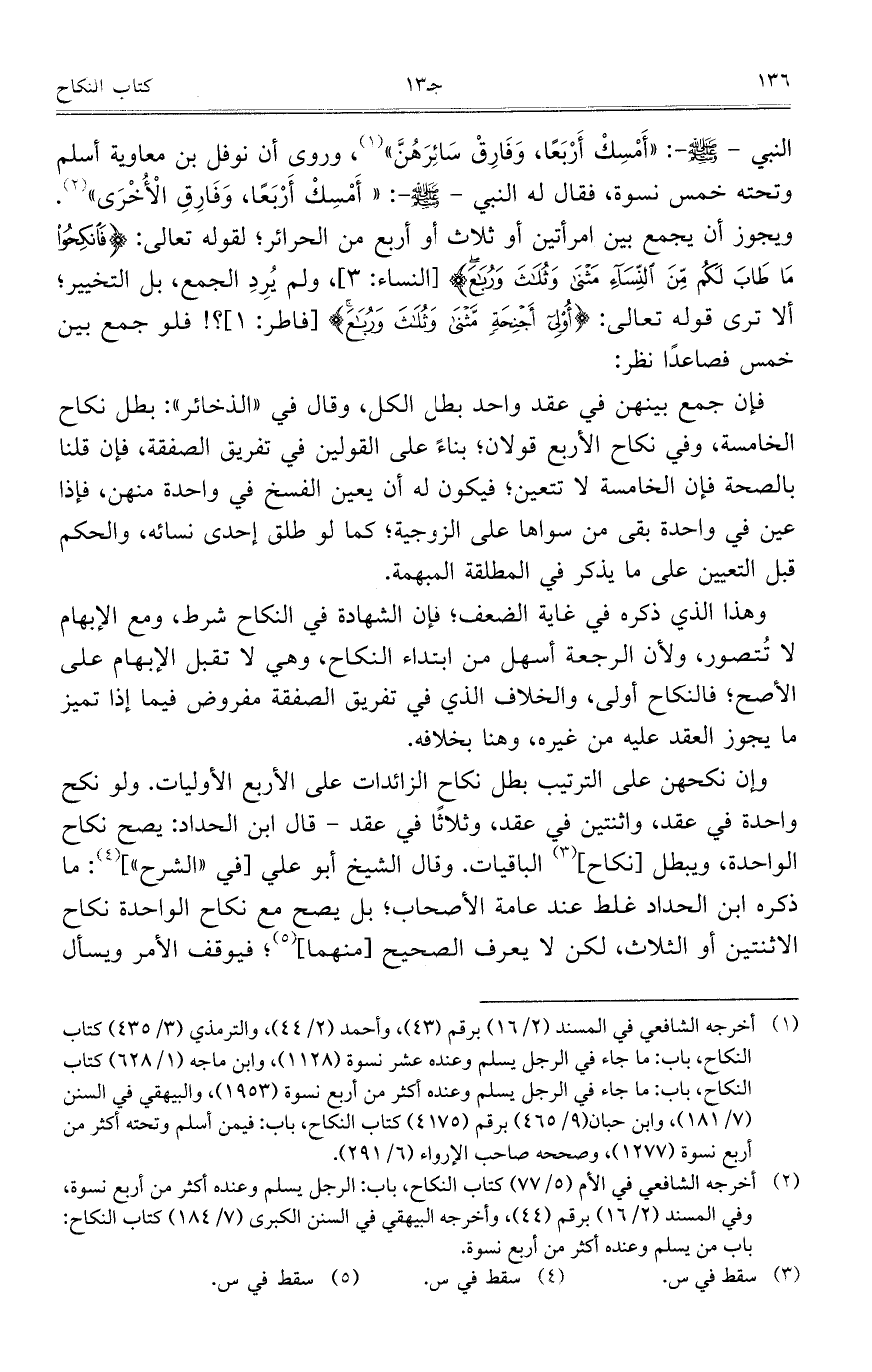 النبي- صلى الله عليه وسلم-: "أَمْسِكْ أَرْبَعاً، وَفَارِقْ سَائِرَهُنَّ"، وروى أن نوفل بن معاوية أسلم وتحته خمس نسوة، فقال له النبي- صلى الله عليه وسلم-: " أَمْسِكْ أَرْبَعاً، وَفَارِقِ الْأُخْرَى". ويجوز أن يجمع بين امرأتين أو ثلاث أو أربع من الحرائر؛ لقوله تعالى: {فَانكِحُوا مَا طَابَ لَكُمْ مِنَ النِّسَاءِ مَثْنَى وَثُلاثَ وَرُبَاعَ} [النساء: 3]، ولم يُرِدِ الجمع، بل التخيير؛ ألا ترى قوله تعالى: {أُولِي أَجْنِحَةٍ مَثْنَى وَثُلاثَ وَرُبَاعَ} [فاطر: 1]؟! فلو جمع بين خمس فصاعداً نظر: