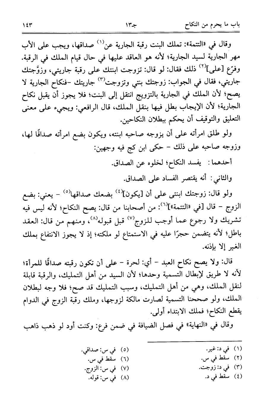 قال: ولا يصح نكاح العبد- أي: لحرة- على أن تكون رقبته صداقاً للمرأة؛ لأنه لا طريق لإبطال التسمية وحدها؛ لأن السيد من أهل التمليك، والرقبة قابلة لنقل الملك، وهي من أهل التمليك، وسبب التمليك قد صح؛ فلا وجه لبطلان الملك، ولو صححنا التسمية لصارت مالكة لزوجها، وملك رقبة الزوج في الدوام يقطع النكاح؛ فملك الابتداء أولى.