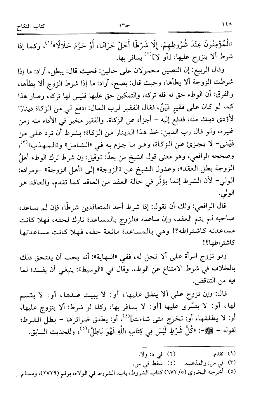 "الْمُؤْمِنُونَ عِنْدَ شُرُوطِهِمْ، إِلَّا شَرْطاً أَحَلَّ حَرَاماً، أَوْ حَرَّمَ حَلَالاً"، وكما إذا شرط ألا يتزوج عليها، [أو لا] يسافر بها.