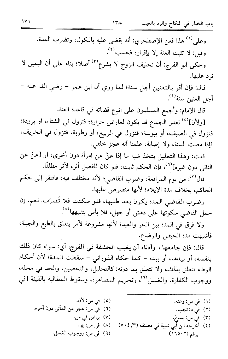 [ولأن] تعذر الجماع قد يكون لعارض حرارة؛ فتزول في الشتاء، أو برودة؛ فتزول في الصيف، أو يبوسة؛ فتزول في الربيع، أو رطوبة، فتزول في الخريف، فإذا مضت السنة، ولا إصابة، علمنا أنه عجز خلقي.