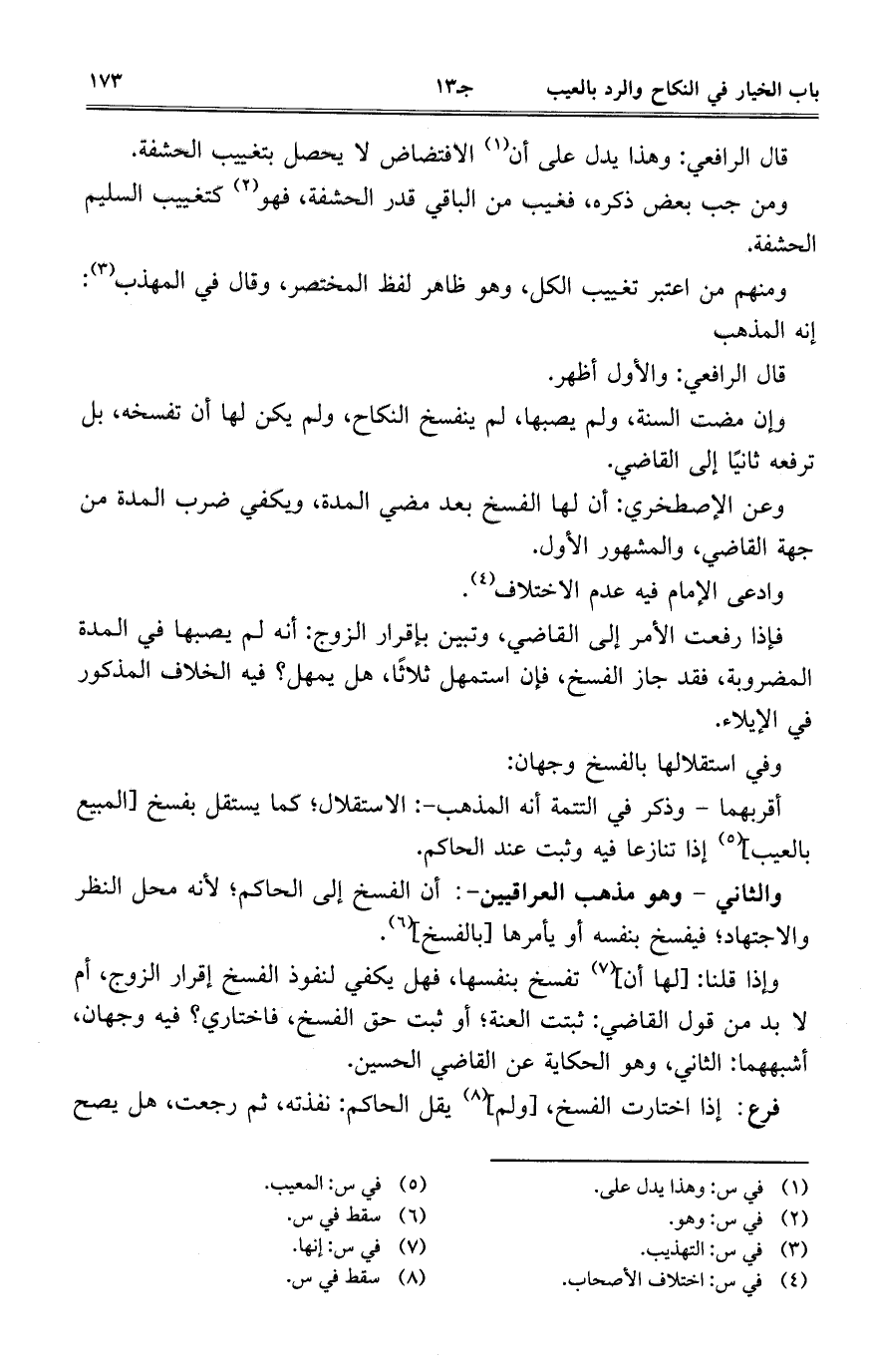والثاني- وهو مذهب العراقيين-: أن الفسخ على الحاكم؛ لأنه محل النظر والاجتهاد؛ فيفسخ بنفسه أو يأمرها [بالفسخ].