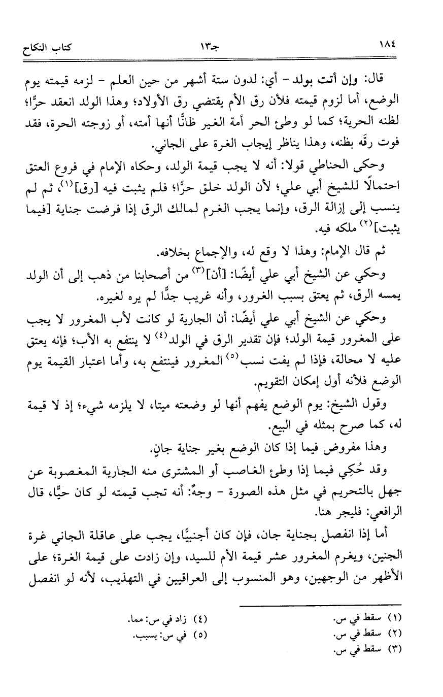 وحكى الحناطي قولاً: أنه لا يجب قيمة الولد، وحكاه الإمام في فروع العتق احتمالاً للشيخ أبي علي؛ لأن الولد خلق حرّاً؛ فلم يثبت فيه [رق]، ثم لم ينسب إلى إزالة الرق، وإنما يجب الغرم لمالك الرق إذا فرضت جناية [فيما يثبت] ملكه فيه.