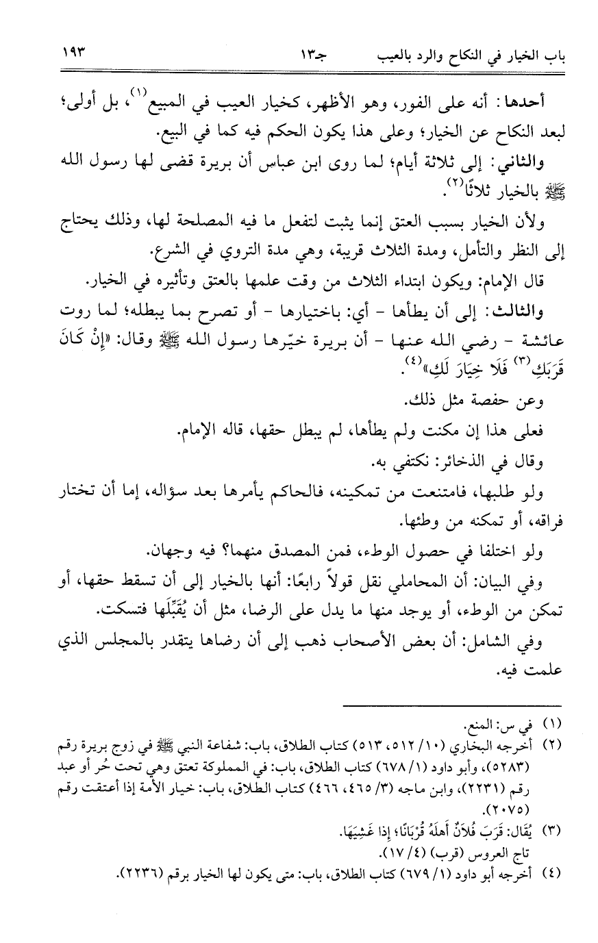 والثالث: إلى أن يطأها- أيك باختيارها- أو تصرح بما يبطله؛ لما روت عائشة- رضي الله عنها- أن بريرة خيّرها رسول الله صلى الله عليه وسلم وقال: "إِنْ كَانَ قَرَبَكِ فَلَا خِيَارَ لَكِ".