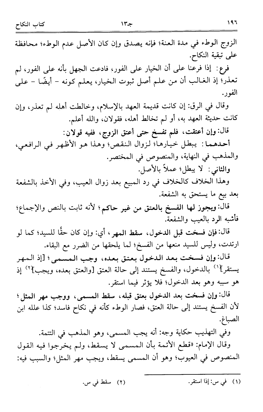 وقال الإمام: "قطع الأئمة بأن المسمى لا يسقط، ولم يخرجوا فيه القول المنصوص في العيوب؛ وهو أن المسمى يسقط، ويجب مهر المثل؛ والسبب فيه: