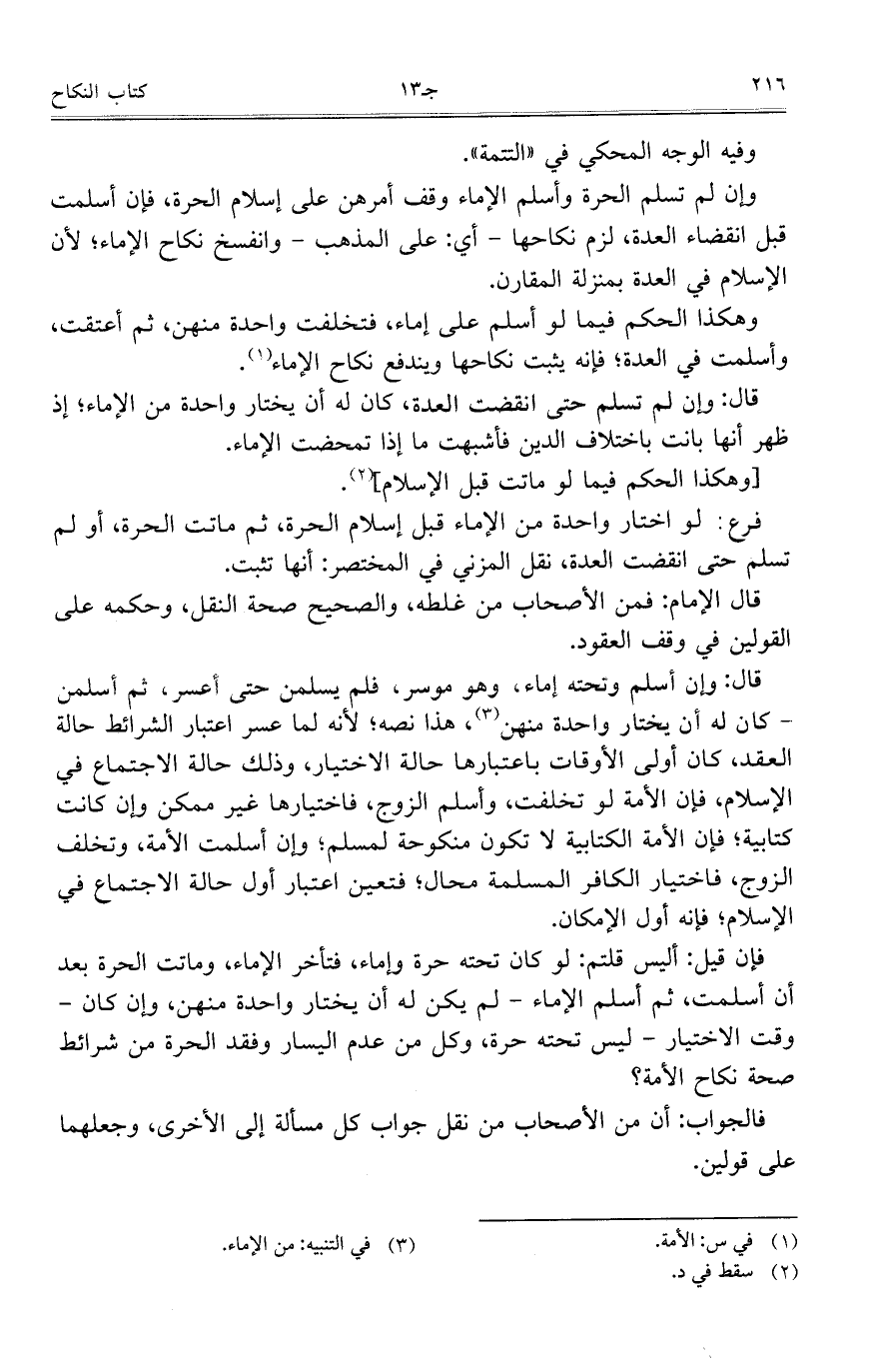 وإن لم تسلم الحرة وأسلم الإماء وقف أمرهن على إسلام الحرة، فإن أسلمت قبل انقضاء العدة، لزم نكاحها- أي: على المذهب- وانفسخ نكاح الإماء؛ لأن الإسلام في العدة بمنزلة المقارن.
