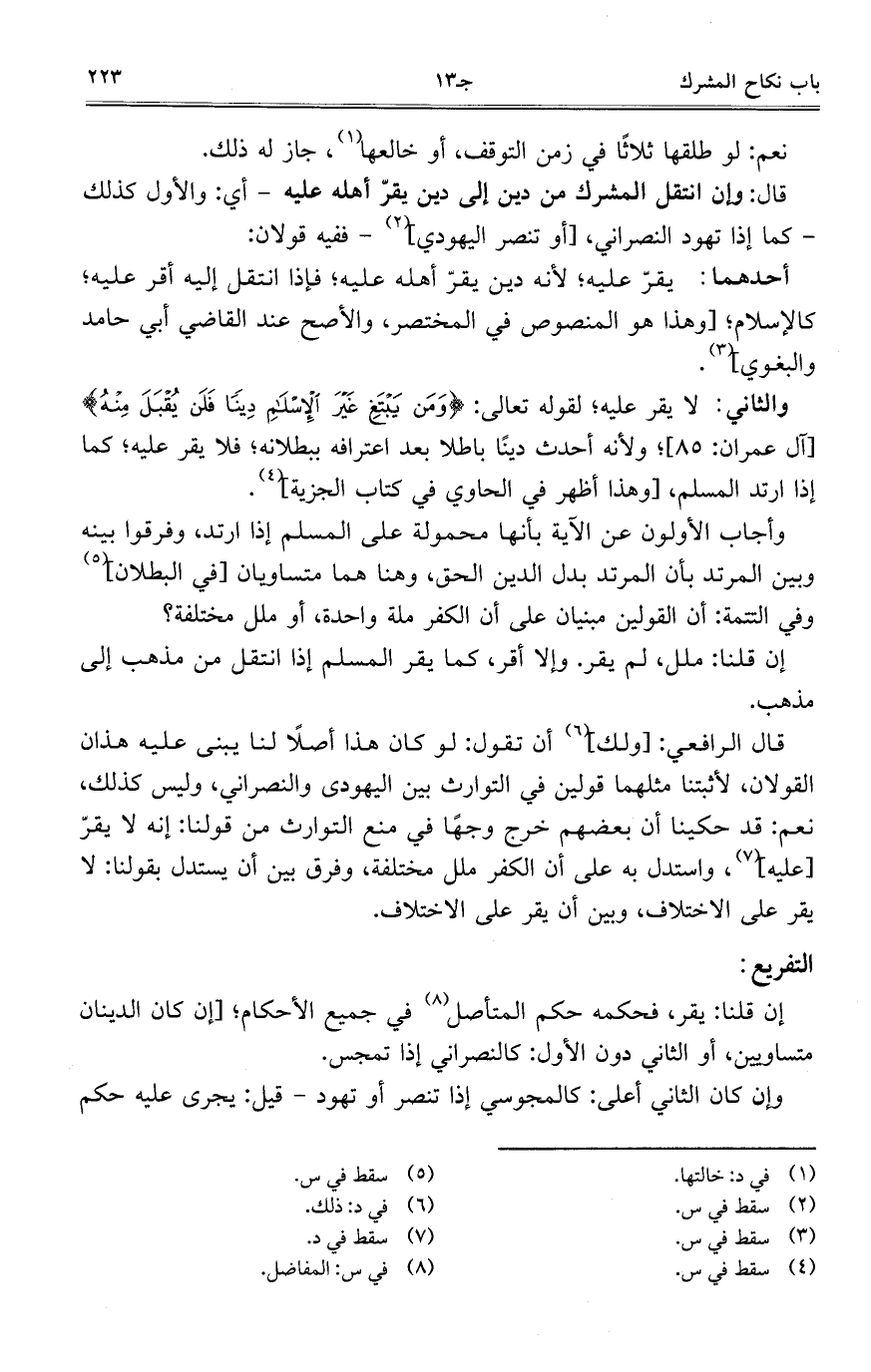 قال الرافعي: [ولك] أن تقول: لو كان هذا أصلاً لنا يبنى عليه هذان القولان، لأثبتنا مثلهما قولين في التوارث بين اليهودي والنصراني، وليس كذلك، نعم: قد حكينا أن بعضهم خرج وجهاً في منع التوارث من قولنا: إنه لا يقرّ [عليه]، واستدل به على أن الكفر ملل مختلفة، وفرق بين أن يستدل بقولنا: لا يقر على الاختلاف، وبين أن يقر على الاختلاف.