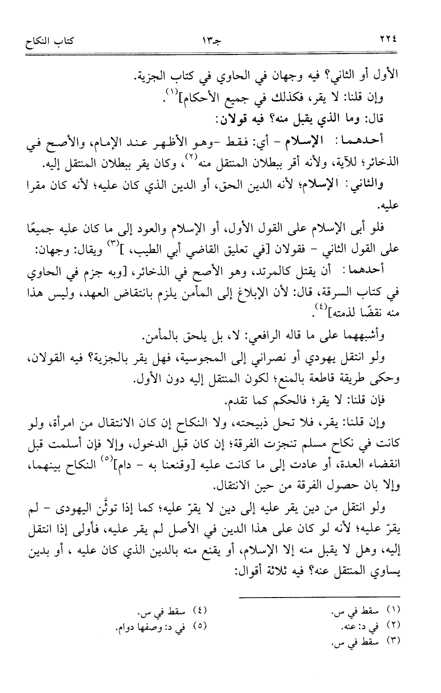أحدهما: الإسلام- أي: فقط- وهو الأظهر عند الإمام، والأصح في الذخائر؛ للآية، ولأنه أقر ببطلان المنتقل منه، وكان يقر ببطلان المنتقل إليه.
