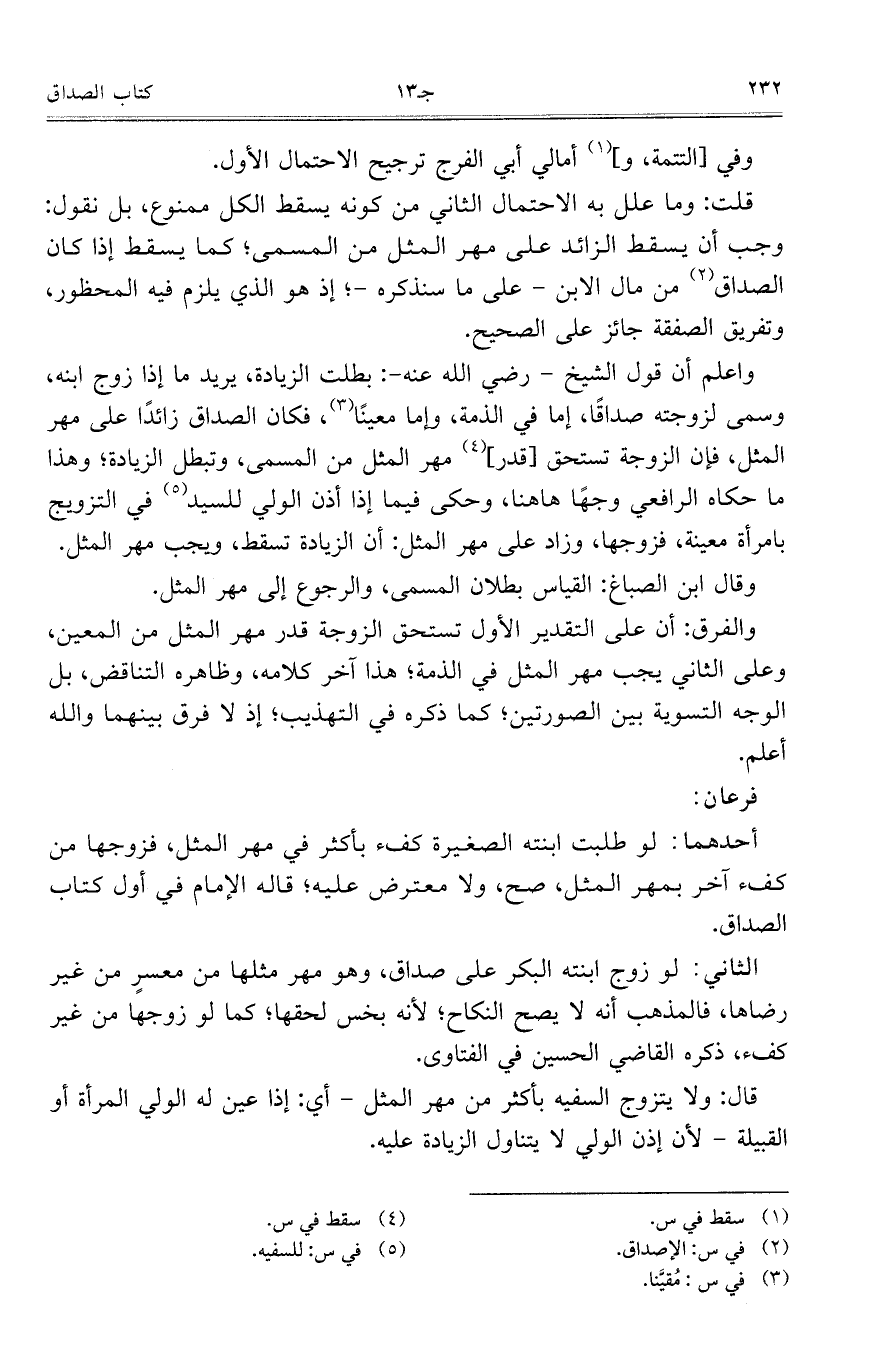 قلت: وما علل به الاحتمال الثاني من كونه يسقط الكل ممنوع، بل نقول: وجب أن يسقط الزائد على مهر المثل من المسمى؛ كما يسقط إذا كان الصداق من مال الابن- على ما سنذكره-؛ إذ هو الذي يلزم فيه المحظور، وتفريق الصفة جائز على الصحيح.