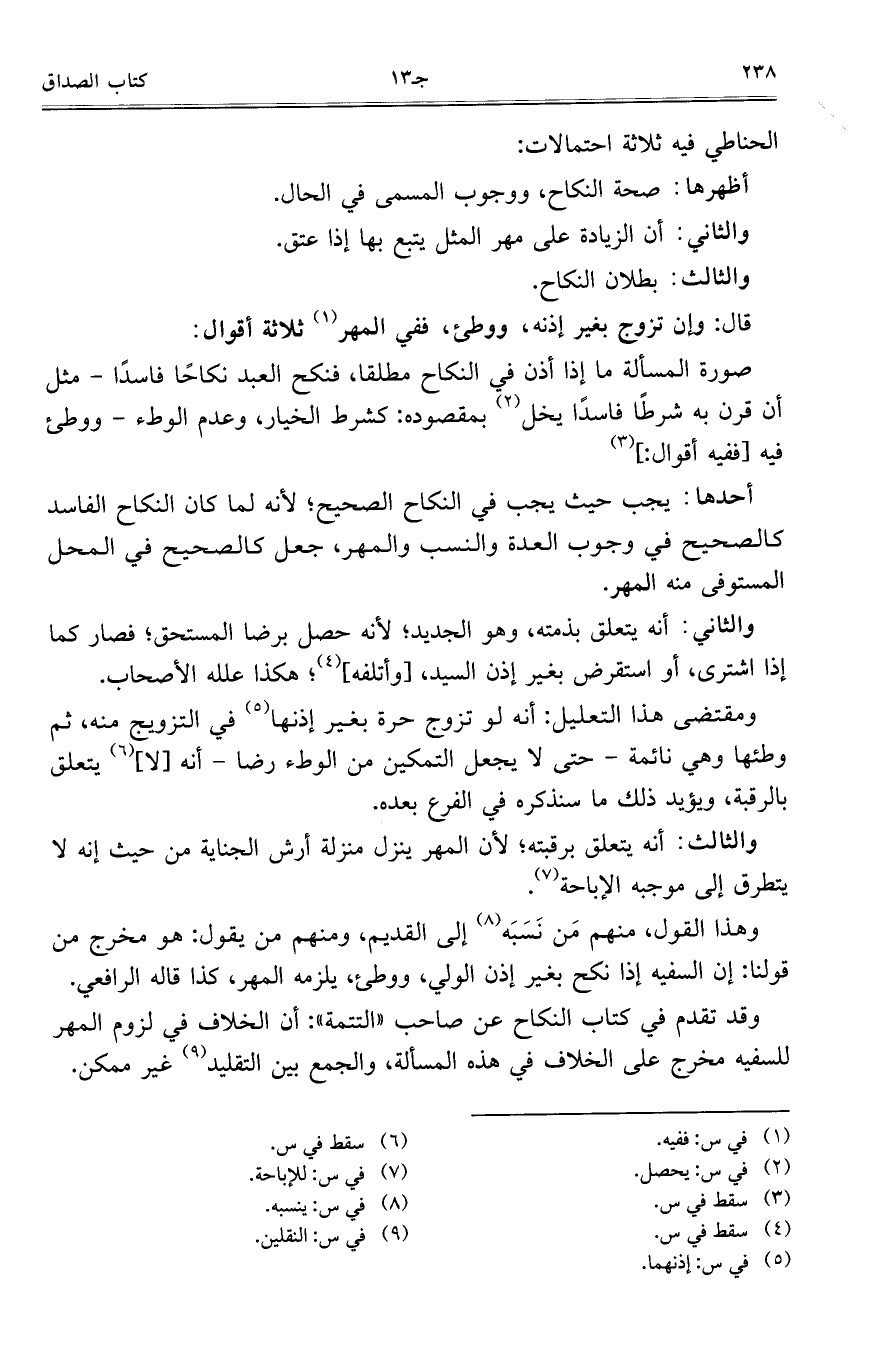 ومقتضى هذا التعليل: أنه لو تزوج حرة بغير إذنها في التزويج منه، ثم وطئها وهي نائمة- حتى لا يجعل التمكين من الوطء رضا- أنه [لا] يتعلق بالرقبة، ويؤيد ذلك ما سنذكره في الفرع بعده.
