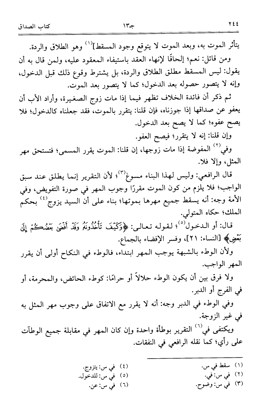 قال الرافعي: وليس لهذا البناء مسوغ؛ لأن التقرير إنما يطلق عند سبق الواجب؛ فلا يلزم من كون الموت مقرراً وجوب المهر في صورة التفويض، وفي الأمة وجه: أنه يسقط جميع مهرها بموتها؛ بناءً على أن السيد يزوج بحكم الملك؛ حكاه المتولي.