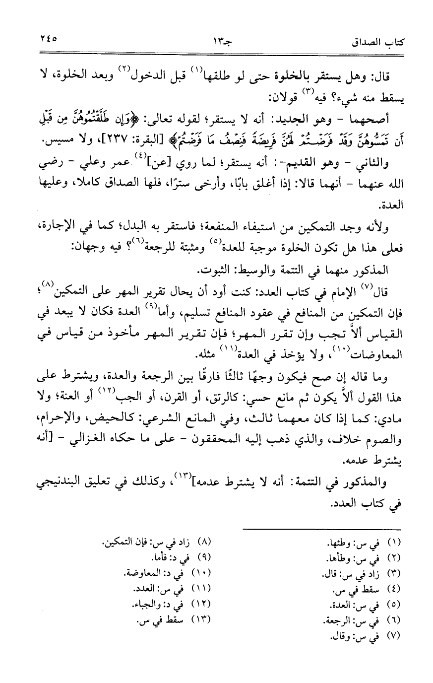 قال: وهل يستقر بالخلوة حتى لو طلقها قبل الدخول وبعد الخلوة، لا يسقط منه شيء؟ فيه قولان: