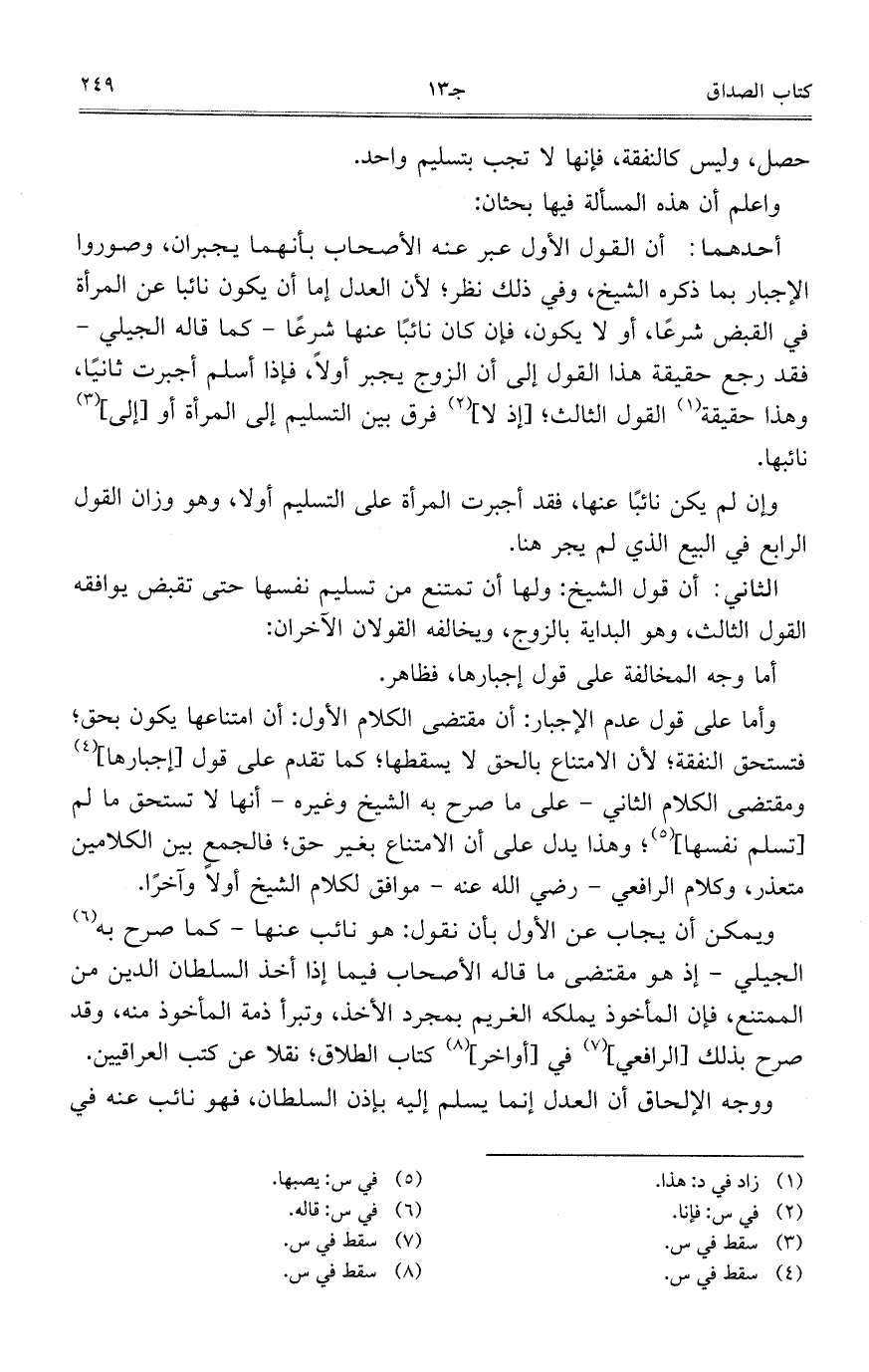 ويمكن أن يجاب عن الأول بأن نقول: هو نائب عنها- كما صرح به الجيلي- إذ هو مقتضى ما قاله الأصحاب فيما إذا أخذ السلطان الدين من الممتنع، فإن المأخوذ يملكه الغريم بمجرد الأخذ، وتبرأ ذمة المأخوذ منه، وقد صرح بذلك [الرافعي] في [أواخر] كتاب الطلاق؛ نقلاً عن كتب العراقيين.