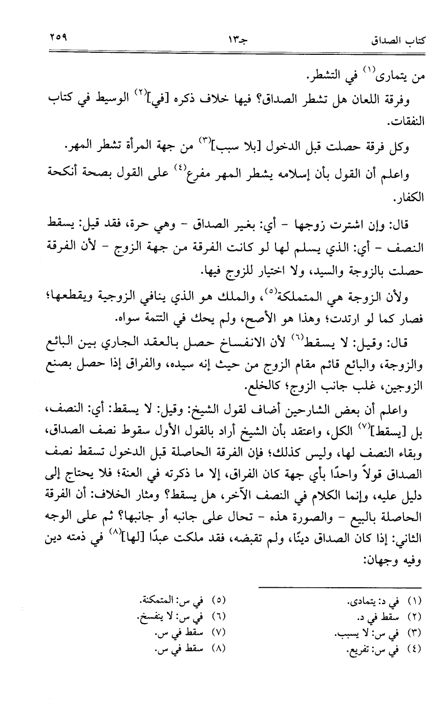 واعلم أن بعض الشارحين أضاف لقول الشيخ: وقيل: لا يسقط: أي: النصف، بل [يسقط] الكل، واعتقد بأن الشيخ أراد بالقول الأول سقوط نصف الصداق، وبقاء النصف لها، وليس كذلك؛ فإن الفرقة الحاصلة قبل الدخول تسقط نصف الصداق قولاً واحداً بأي جهة كان الفراق، إلا ما ذكرته في العنة؛ فلا يحتاج إلى دليل عليه، وإنما الكلام في النصف الآخر، هل يسقط؟ ومثار الخلاف: أن الفرقة الحاصلة بالبيع- والصورة هذه- تحال على جانبه أو جانبها؟ ثم على الوجه الثاني: إذا كان الصداق ديناً، ولم تقبضه، فقد ملكت عبداً [لها] في ذمته دين وفيه وجهان: