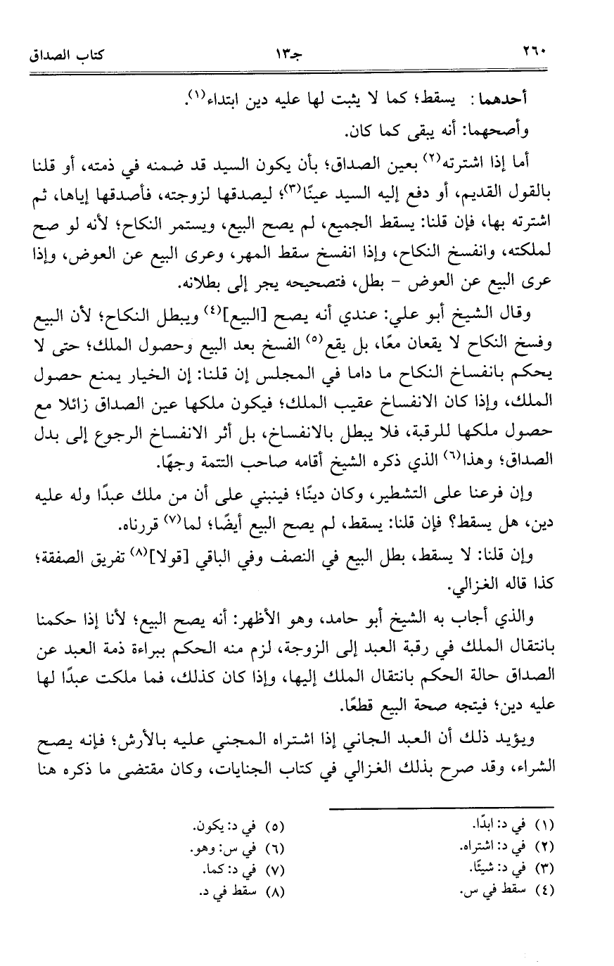 وقال الشيخ أبو عليك عندي أنه يصح [البيع] ويبطل النكاح؛ لأن البيع وفسخ النكاح لا يقعان معاً، بل يقع الفسخ بعد البيع وحصول الملك؛ حتى لا يحكم بانفساخ النكاح ما داما في المجلس إن قلنا: إن الخيار يمنع حصول الملك، وإذا كان الانفساخ عقيب الملك؛ فيكون ملكها عين الصداق زائلاً مع حصول ملكها للرقبة، فلا يبطل بالانفساخ، بل أثر الانفساخ الرجوع إلى بدل الصداق؛ وهذا الذي ذكره الشيخ أقامه صاحب التتمة وجهاً.