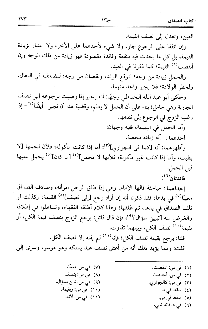 إحداهما: مباحثة قالها الإمام، وهي إذا طلق الرجل امرأته، وصادف الصداق معيباً في يدها، فقد ذكرنا أنه إن أراد رجع [إلى نصف] القيمة، وكذلك لو تلف الصداق في يدها، ثم طلقها؛ وهذا كلام أطلقه الفقهاء، وتساهلوا في إطلاقه والغرض منه [تبيين سؤال]، فإن قال قائل: يرجع الزوج بنصف قيمة الكل، أو بقيمة نصف الكل، وبينهما تفاوت.