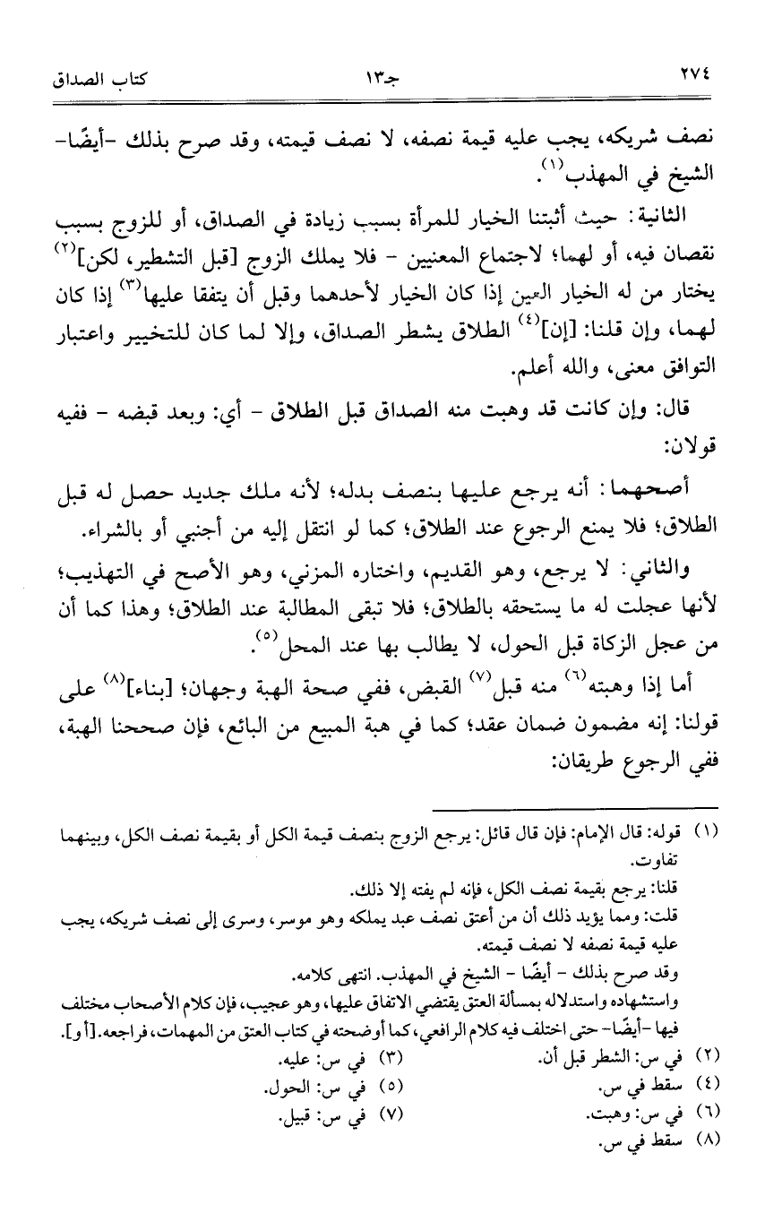 الثانية: حيث أثبتنا الخيار للمرأة بسبب زيادة في الصداق، أو للزوج بسبب نقصان فيه، أو لهما؛ لاجتماع المعنيين- فلا يملك الزوج [قبل التشطير، لكن] يختار من له الخيار العين إذا كان الخيار لأحدهما وقبل أن يتفقا عليها إذا كان لهما، وإن قلنا: [إن] الطلاق يشطر الصداق، وإلا لما كان للتخيير واعتبار التوافق معنى، والله أعلم.