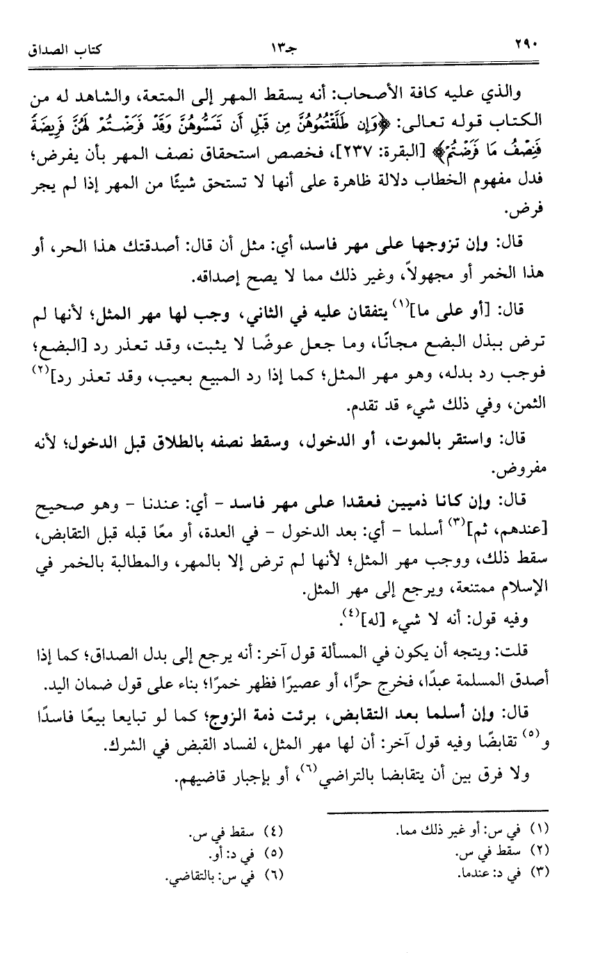 قال: وإن كانا ذميين فعقدا على مهر فاسد- أي: عندنا- وهو صحيح [عندهم، ثم] أسلما- أي: بعد الدخول- في العدة، أو معاً قبله قبل التقابض، سقط ذلك، ووجب مهر المثل؛ لأنها لم ترض إلا بالمهر، والمطالبة بالخمر في الإسلام ممتنعة، ويرجع إلى مهر المثل.
