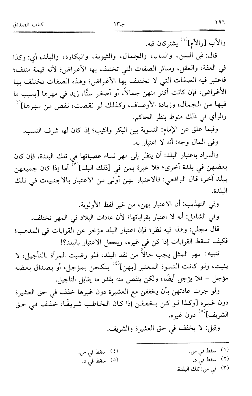 ولو جرت عادتهن بأن يخففن مع العشيرة دون غيرها خفف في حق العشيرة دون غيره [وكذا لو كن يخففن إذا كان الخاطب شريفاً، خفف في حق الشريف] دون غيره.