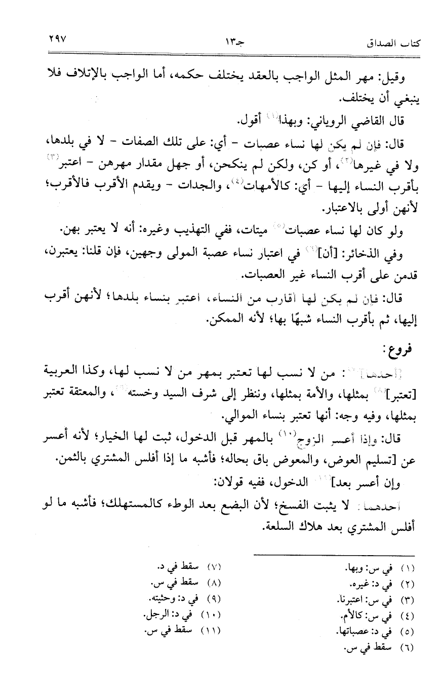 [أحدها]: من لا نسب لها تعتبر بمهر من لا نسب لها، وكذا العربية [تعتبر] بمثلها، والأمة بمثلها، وننظر إلى شرف السيد وخسته، والمعتقة تعتبر بمثلها، وفيه وجه: أنها تعتبر بنساء الموالي.