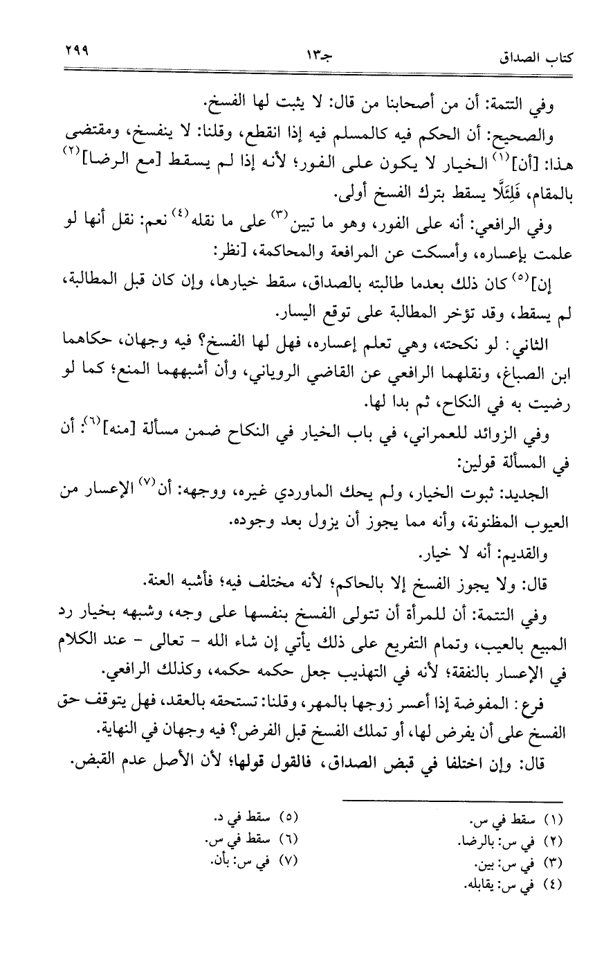 وفي الرافعي: أنه على الفور، وهو ما تبين على ما نقله نعم: نقل أنها لو علمت بإعساره، وأمسكت عن المرافعة والمحاكمة، [نظر:
