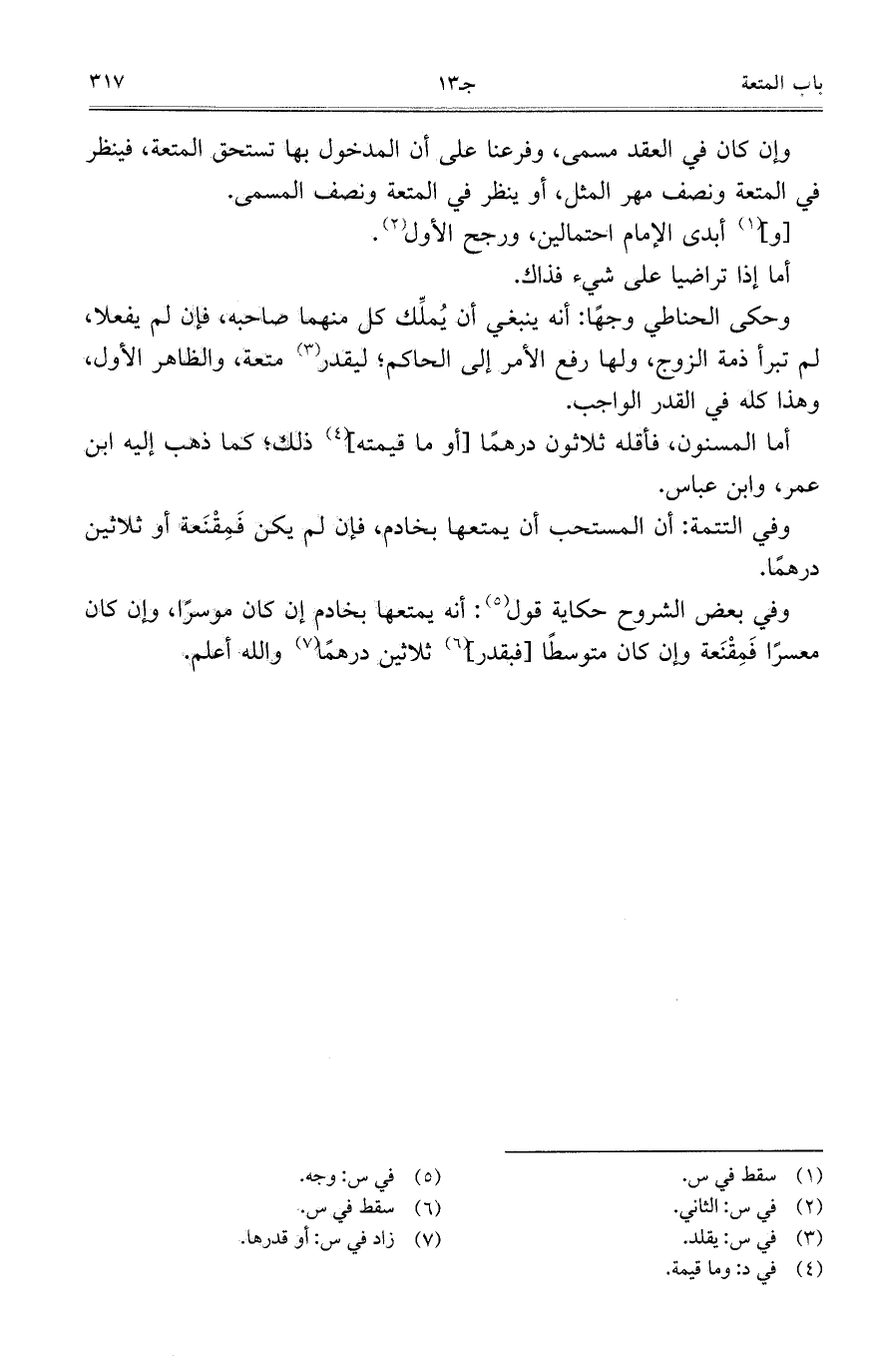 وفي بعض الشروح حكاية قول: أنه يمتعها بخادم إن كان موسراً، وإن كان معسراً فَمِقْنَعة وإن كان متوسطاً [فبقدر] ثلاثين درهماً والله أعلم.