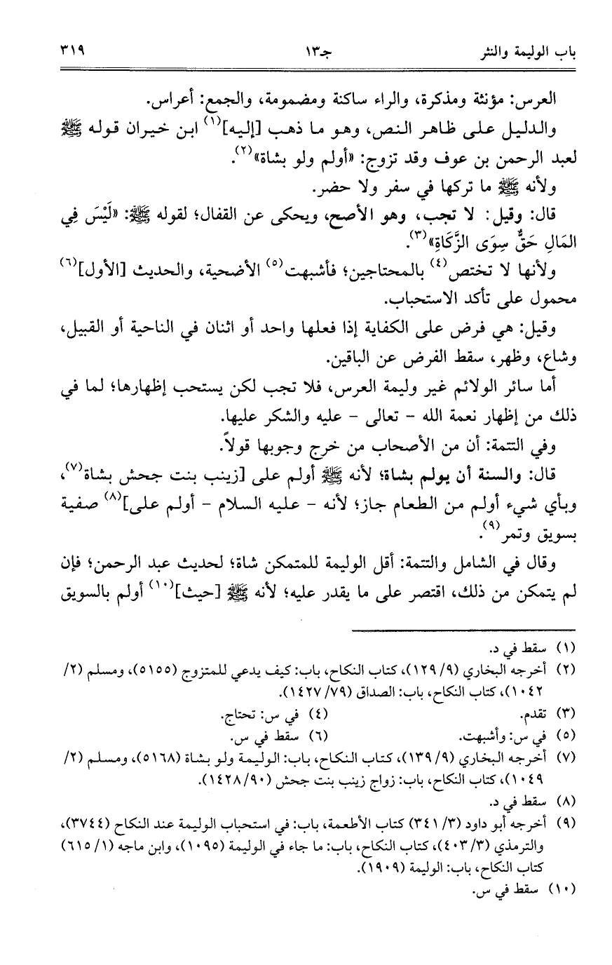 وقال في الشامل والتتمة: أقل الوليمة للمتمكن شاة؛ لحديث عبد الرحمن؛ فإن لم يتمكن من ذلك، اقتصر على ما يقدر عليه؛ لأنه صلى الله عليه وسلم [حيث] أولم بالسويق