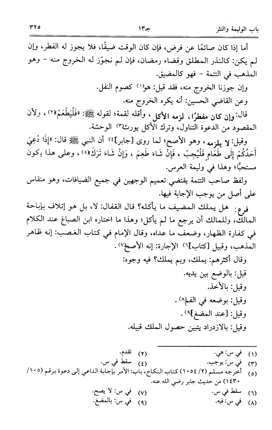 وقيل: لا يلزمه، وهو الأصح؛ لما روى [جابر] أن النبي صلى الله عليه وسلم قال: "إِذَا دُعِيَ أَحَدُكُمْ إِلَى طَعَامٍ فَلْيُجِبْ، فَإِنْ شَاءَ طَعِمَ، وَإِنْ شَاءَ تَرَكَ"، وعلى هذا يكون مستحبّاً؛ وهذا في وليمة العرس.