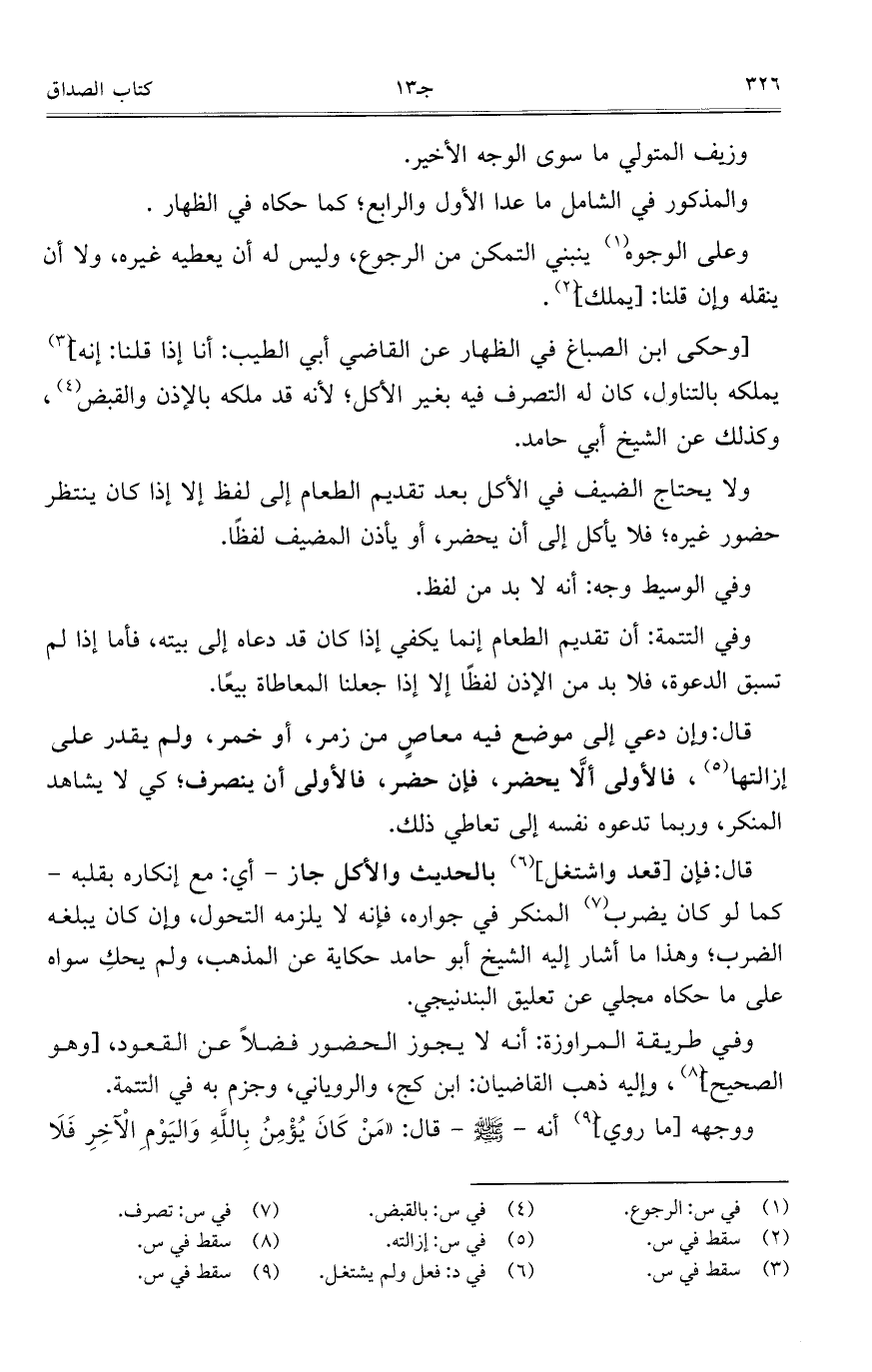 ولا يحتاج الضيف في الأكل بعد تقديم الطعام إلى لفظ إلا إذا كان ينتظر حضور غيره؛ فلا يأكل إلى أن يحضر، أو يأذن المضيف لفظاً.