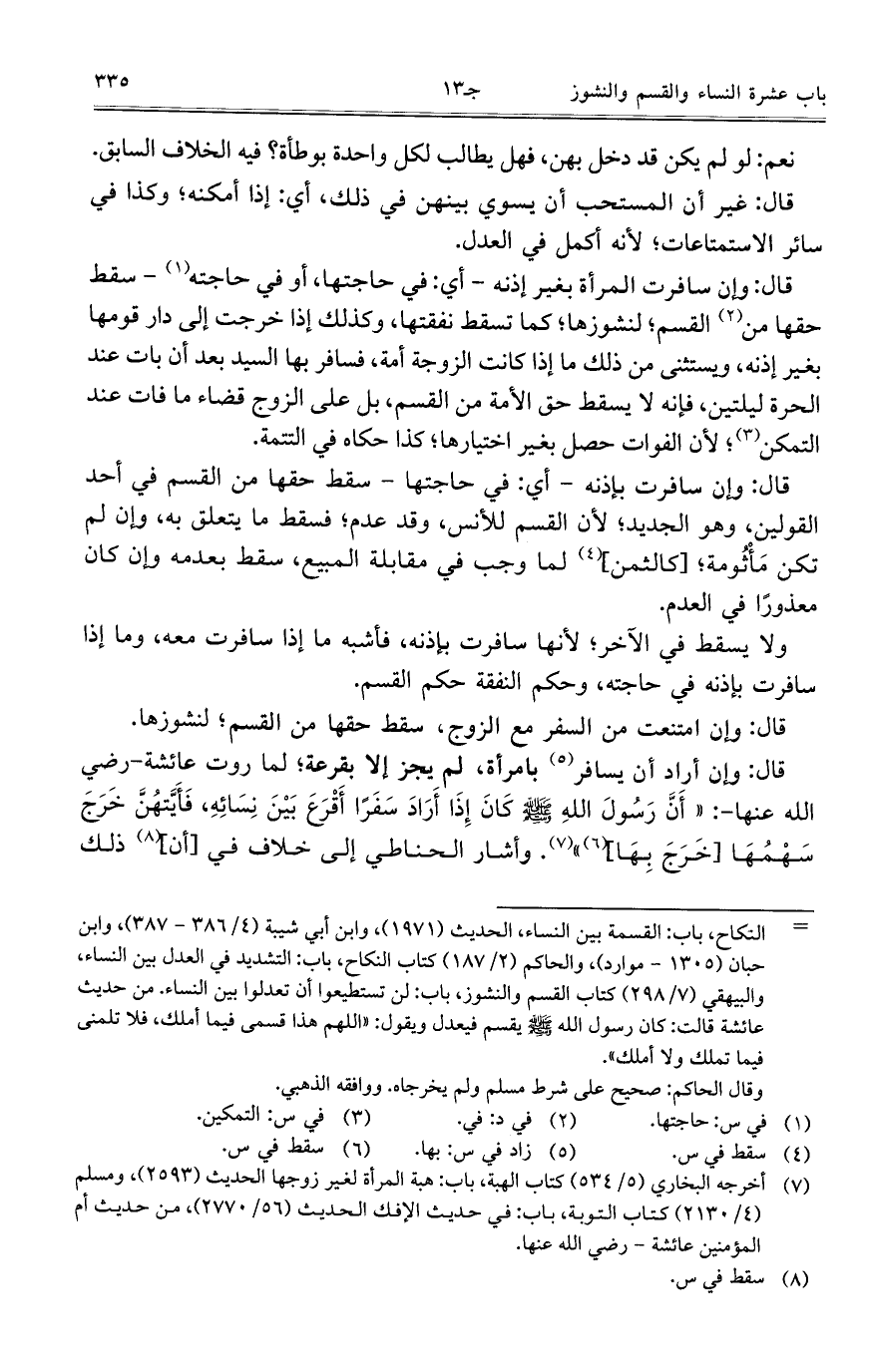 قال: وإن سافرت بإذنه- أي: في حاجتها- سقط حقها من القسم في أحد القولين، وهو الجديد؛ لأن القسم للأنس، وقد عدم؛ فسقط ما يتعلق به، وإن لم تكن مَاثُومة؛ [كالثمن] لما وجب في مقابلة المبيع، سقط بعدمه وإن كان معذوراً في العدم.