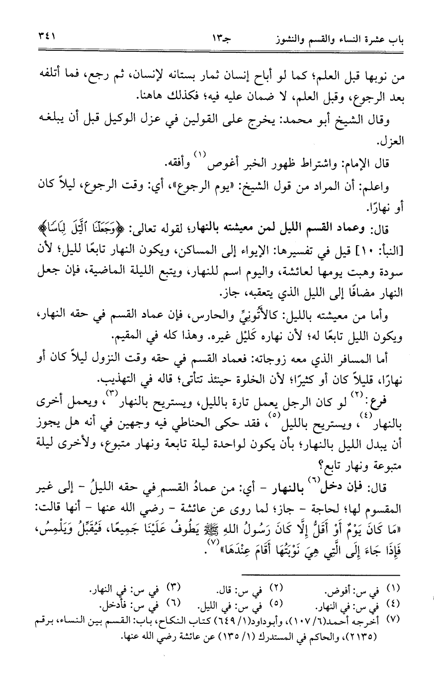 قال: فإن دخل بالنهار- أي: من عمادُ القسمِ في حقه الليلُ- إلى غير المقسوم لها؛ لحاجة- جاز؛ لما روى عن عائشة- رضي الله عنها- أنها قالت: "مَا كَانَ يَوْمٌ أَوْ أَقَلُّ إِلَّا كَانَ رَسُولُ اللهِ صلى الله عليه وسلم يَطُوفُ عَلَيْنَا جَمِيعاً، فَيُقَبِّلُ وَيَلْمِسُ، فَإِذَا جَاءَ إِلَى الَّتِي هِيَ نَوْبَتُهَا أَقَامَ عِنْدَهَا".