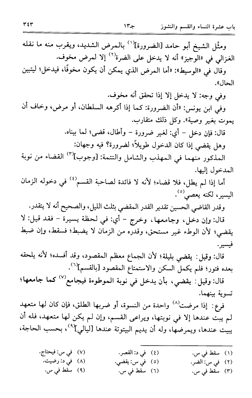 ومثَّل الشيخ أبو حامد [الضرورة] بالمرض الشديد، ويقرب منه ما نقله الغزالي في "الوجيز" أنه لا يدخل على الضرة إلا لمرض مخوف.