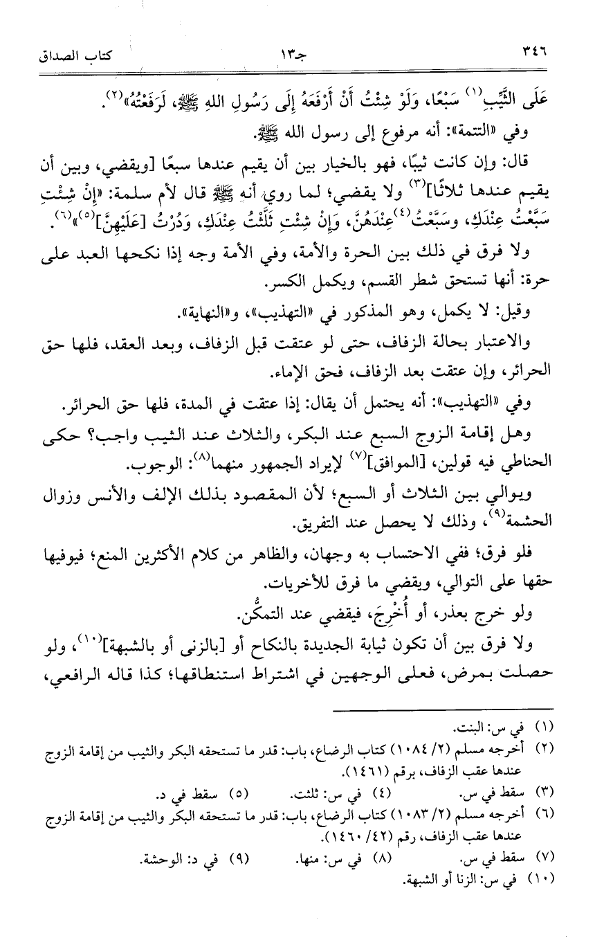 وهل إقامة الزوج السبع عند البكر، والثلاث عند الثيب واجب؟ حكى الحناطي فيه قولين، [الموفاق] لإيراد الجمهور منهما: الوجوب.