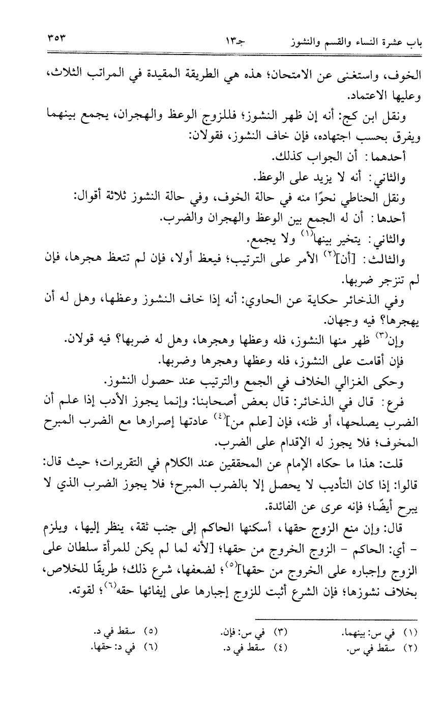 ونقل الحناطي نحواً منه في حالة الخوف، وفي حالة النشوز ثلاثة أقوال:
