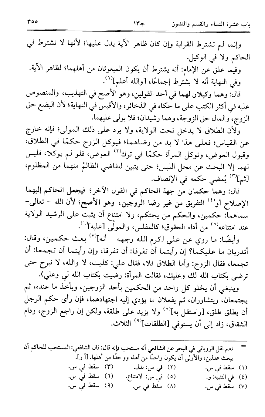 ولأن الطلاق لا يدخل تحت الولاية، ولا يرد على ذلك المولى؛ فإنه خارج عن القياس؛ فعلى هذا لابد من رضاهما؛ فيوكل الزوج حكماً في الطلاق، وقبول العوض، وتوكل المرأة حكماً في ترك العوض، فلو لم يوكلا، فليس لهما إلا البحث عن محل اللبس؛ حتى يتبين للقاضي الظالمُ منهما من المظلوم، [ثم] يُمضي حكمه في الإنصاف.