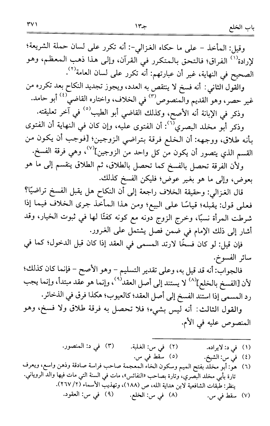 قال الغزالي: وحقيقة الخلاف راجعة إلى أن النكاح هل يقبل الفسخ تراضياً؟ فعلى قول: يقبله؛ قياساً على البيع؛ ومن هذا المأخذ جرى الخلاف فيما إذا شرطت المرأة نسباً، وخرج الزوج دونه مع كونه كفئاً لها في ثبوت الخيار، وقد أشار إلى ذلك الإمام في ضمن فصل يشتمل على الغرور.
