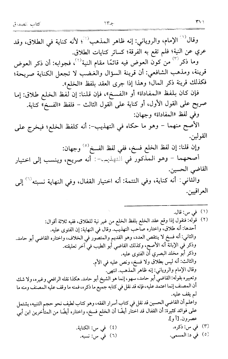 وما ذكر من كون العوض فيه قائماً مقام النية، فجوابه: أن ذكرالعوض قرينة، ومذهب الشافعي: أن قرينة السؤال والغضب لا تجعل الكناية صريحة؛ فكذلك قرينة ذكر المال؛ وهذا إذا جرى العقد بلفظ "الخلع".